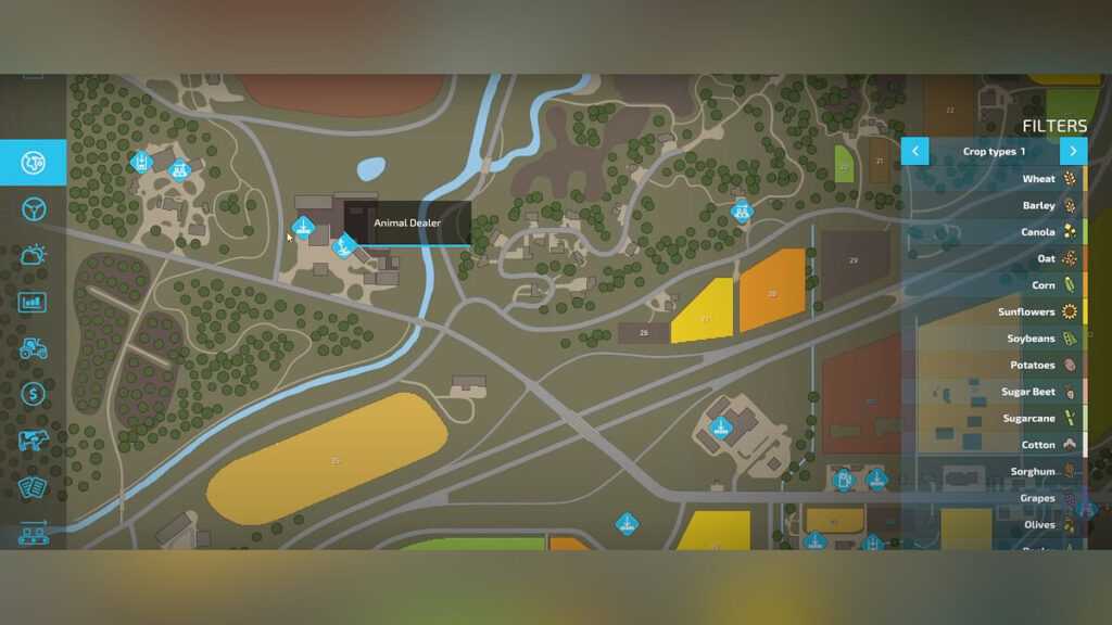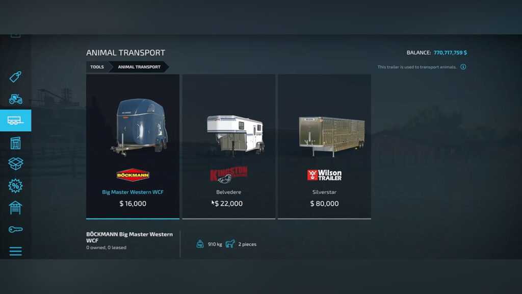 Подъезжайте к точке торговли животными, которая отмечена на карте голубой коровьей головой, с подготовленным трейлером. Припаркуйтесь на маркере лапы и откройте торговое меню. Здесь можно покупать и продавать животных.