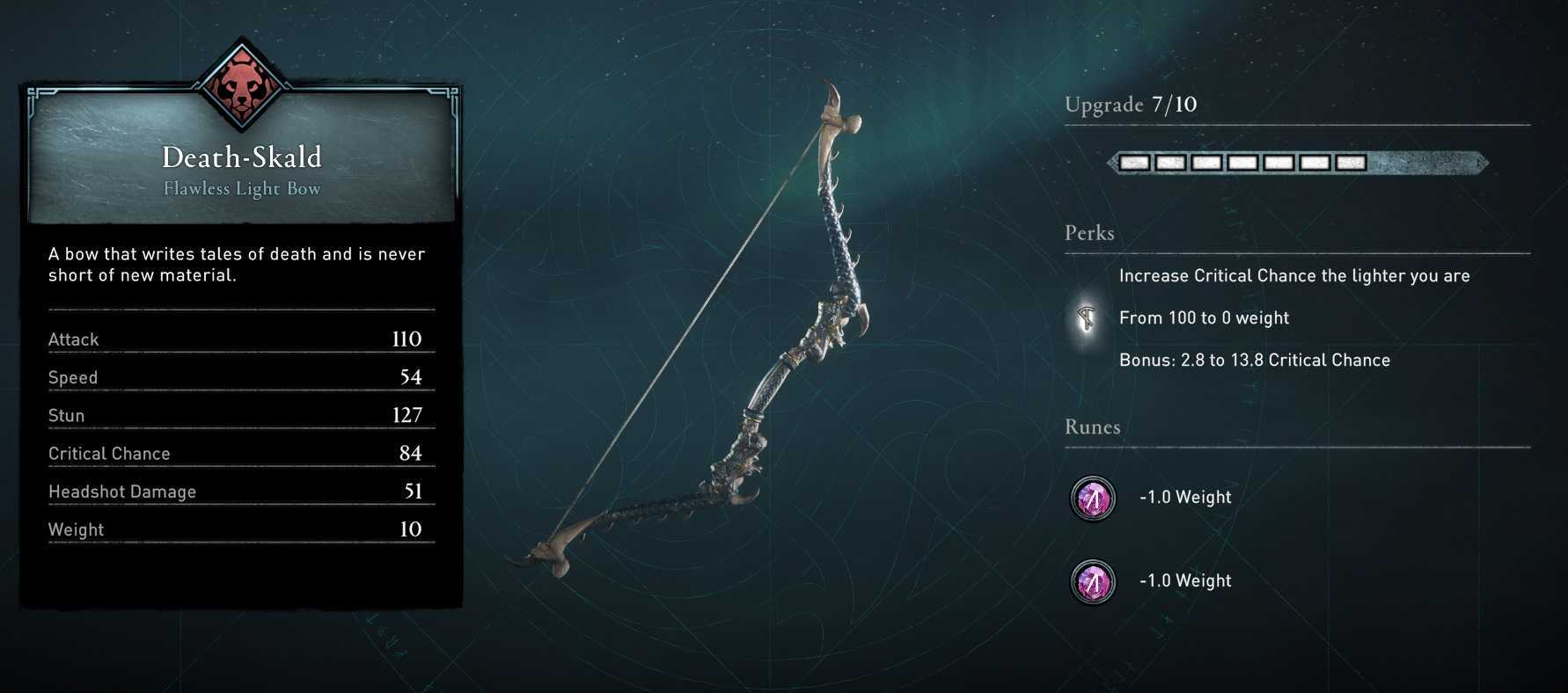 Этот мощный легкий лук увеличивает шанс критического удара, чем вы легче. Без доспехов или другого оружия вы будете критиковать каждый выстрел, что сделает вас сильным нудистом. Это упрощает сложный бег без доспехов. Тем не менее, он хорошо сочетается с большинством доспехов и кинжалов ворона из-за их небольшого веса.