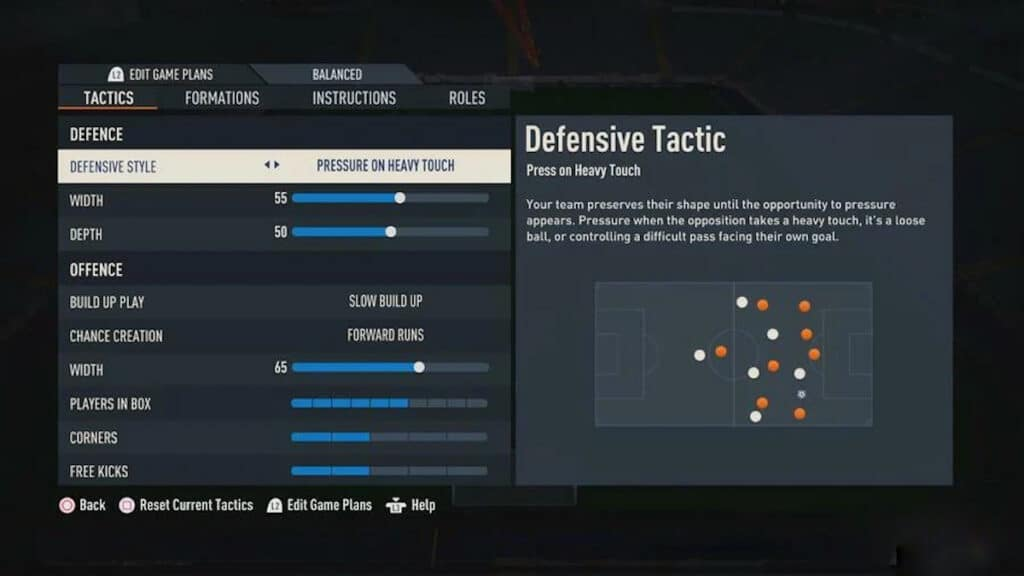 Как и атакующая тактика, правильная оборонительная установка важна для успешной игры в футбол. Используя ползунок ширины/глубины, игроки могут выбрать расположение своей оборонительной линии.
