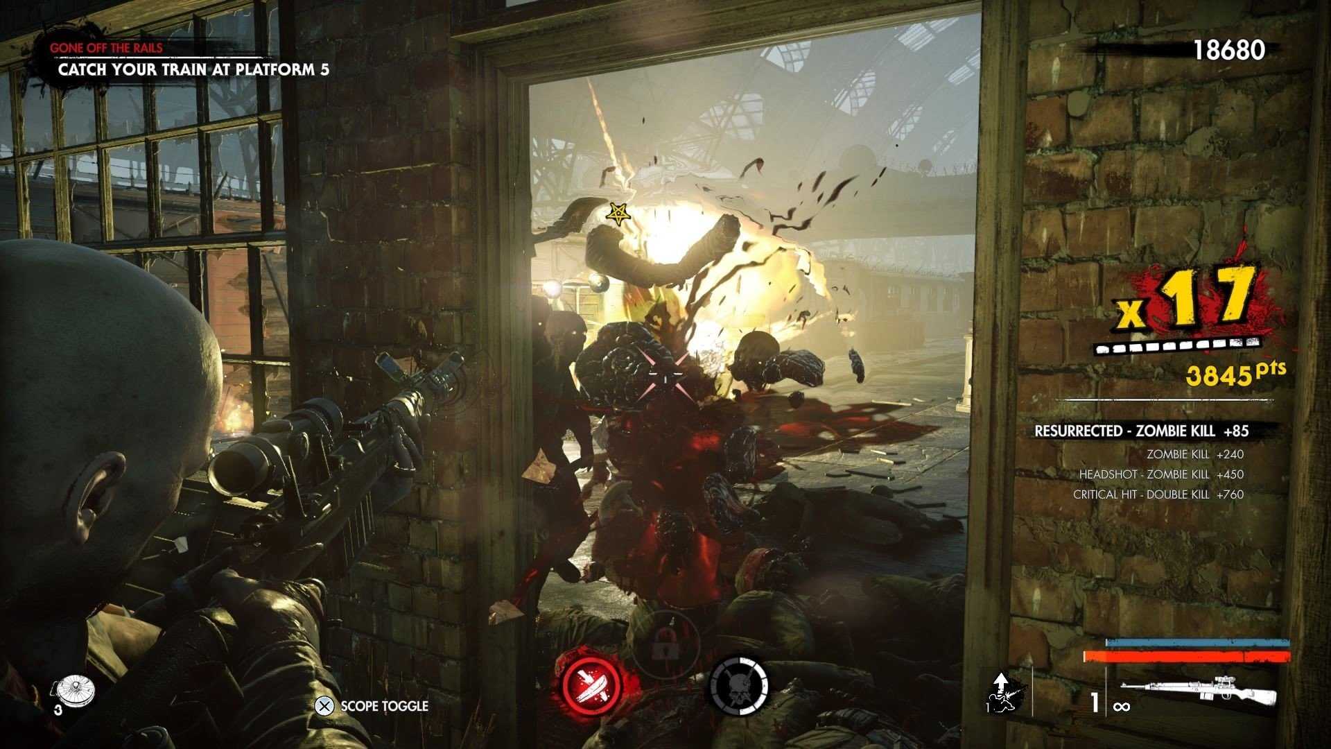 Достаточно трудное задание, требующее сноровки и выдержки. Ряд поверхностей (железо или одиночные камни, например), способны отражать пули. Выстрелив и увидев яркий луч, будет означать, что это был рикошет. Вы можете убивать подобным способом около каждого фонтана крови, или выпустив очередь в крупную группу врагов. Желательно, чтобы среди рядовых зомби был Железный гигант, так как несколько попаданий в его броню задевают рикошетом и рядом находящихся мертвецов.