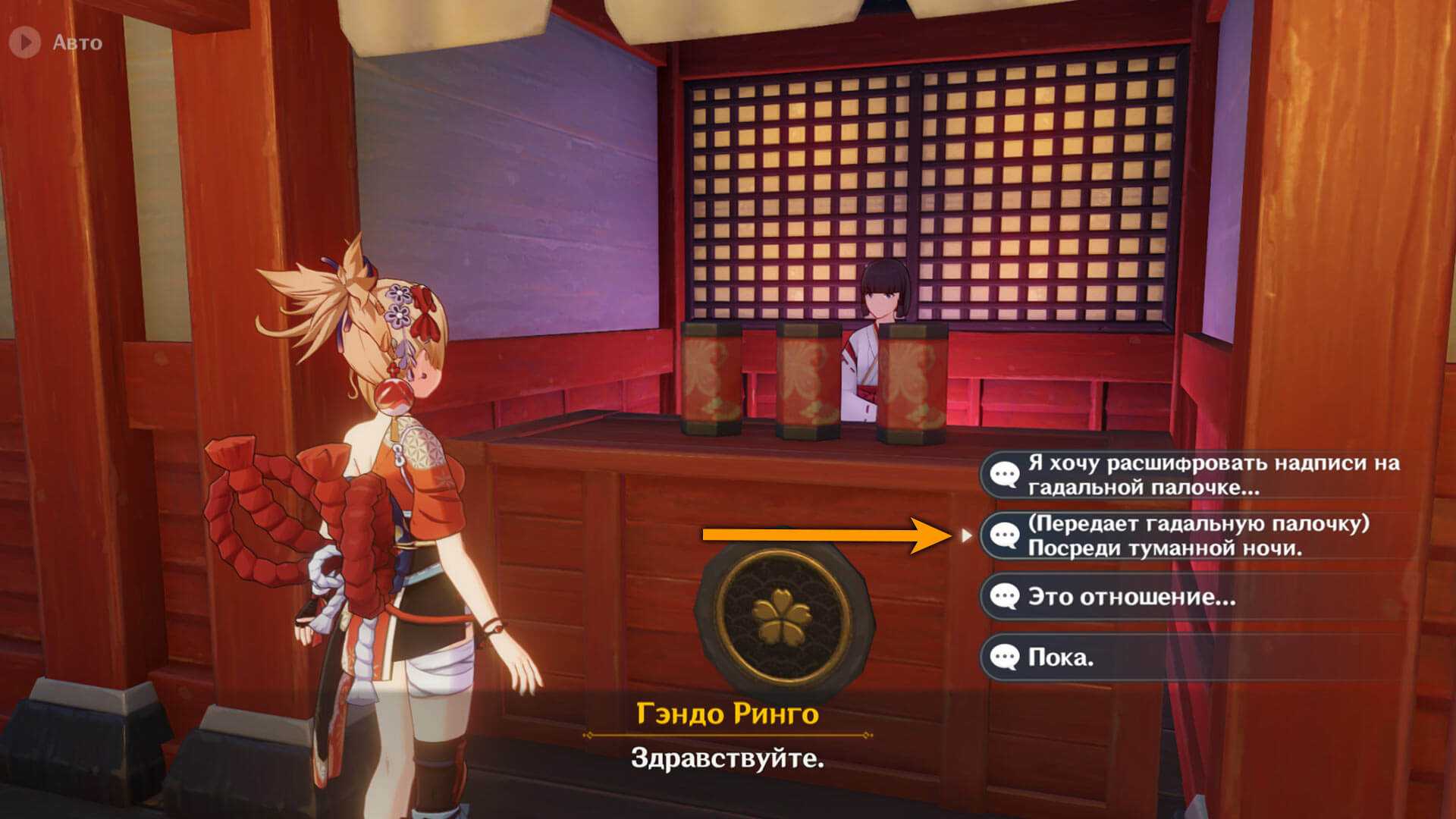Идем в Великий храм Наруками к Гэндо Ринго. Из Ящика предсказаний вытягиваем гадальную палочку.