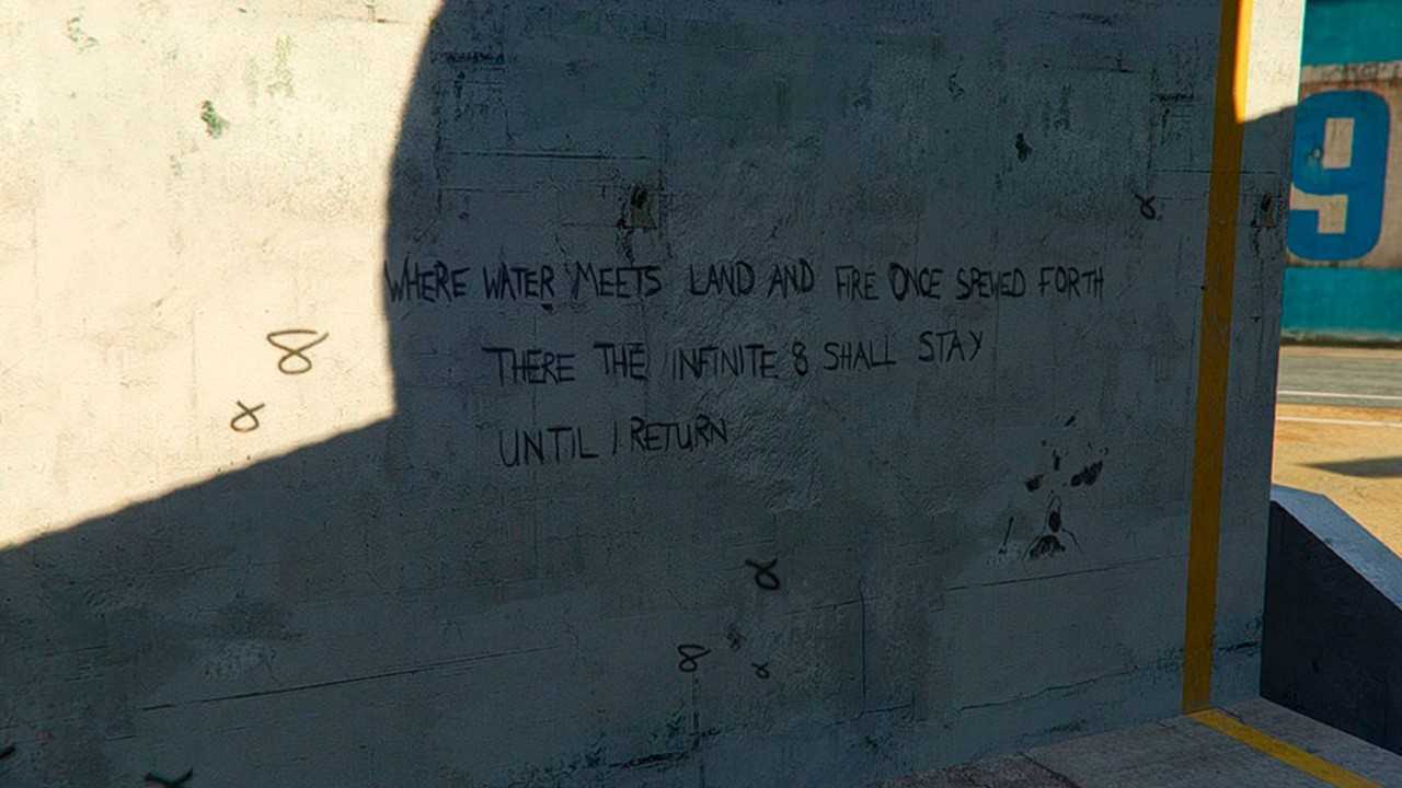 История берет свое начало в одном полуразрушенном доме в Сэнди Шорс. Именно в нем на стене игроки нашли три надписи, которые имеют отношение к нашему делу. Пойдем по порядку.