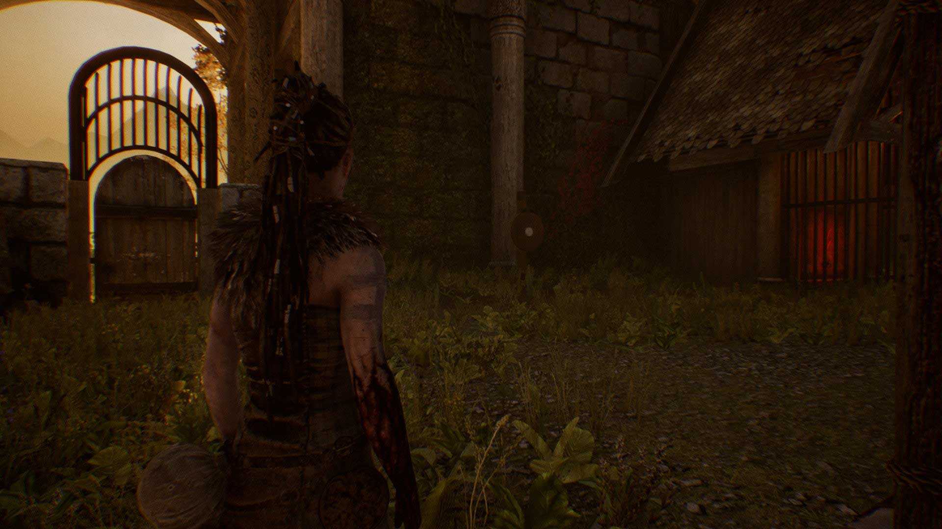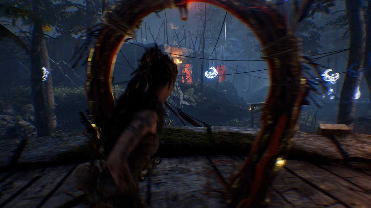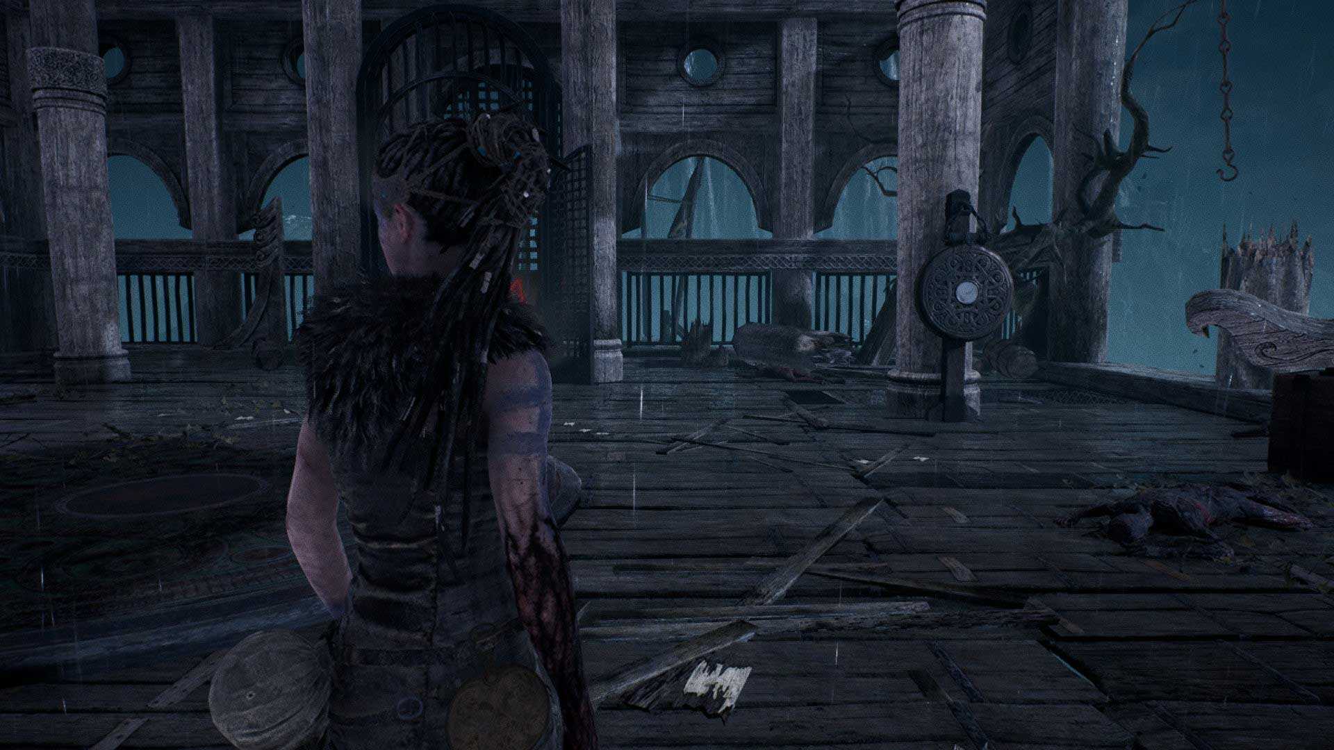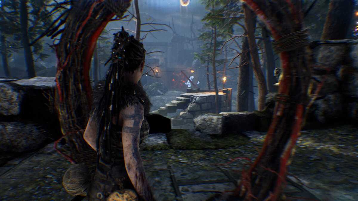 Сразу же бегите вперед, к свету. Сенуа потеряет рассудок и потеряет череп, принадлежащий ее любимому. После возвращения контроля над героиней, идите направо и продвигайтесь к краю. Пройдите через дыру в решетке и возьмите факел. Спуститесь вниз и пройдите через мост. Пройдите под доской и идите к двери с руной.