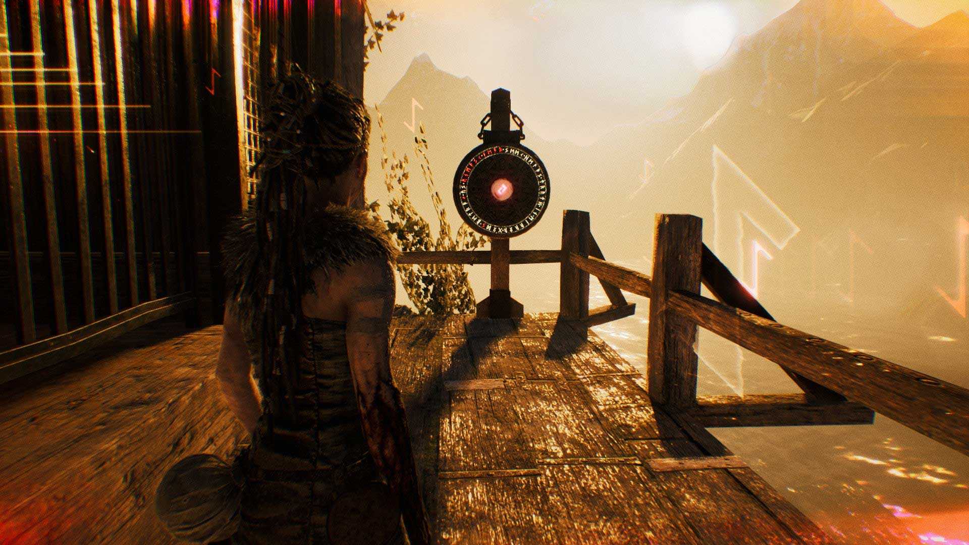 Вернитесь в главный зал и еще раз взгляните на знак, висящий на цепях, чтобы открыть вторую руну. Спуститесь по лестнице, чтобы взаимодействовать с МОНУМЕНТОМ с руной и открыть дверь. Перед вами будет дверь с другими рунами – разблокируйте ее и продолжайте движение по мосту, чтобы запустилась кат-сцена. Сенуа не готова сразиться с Хелой!