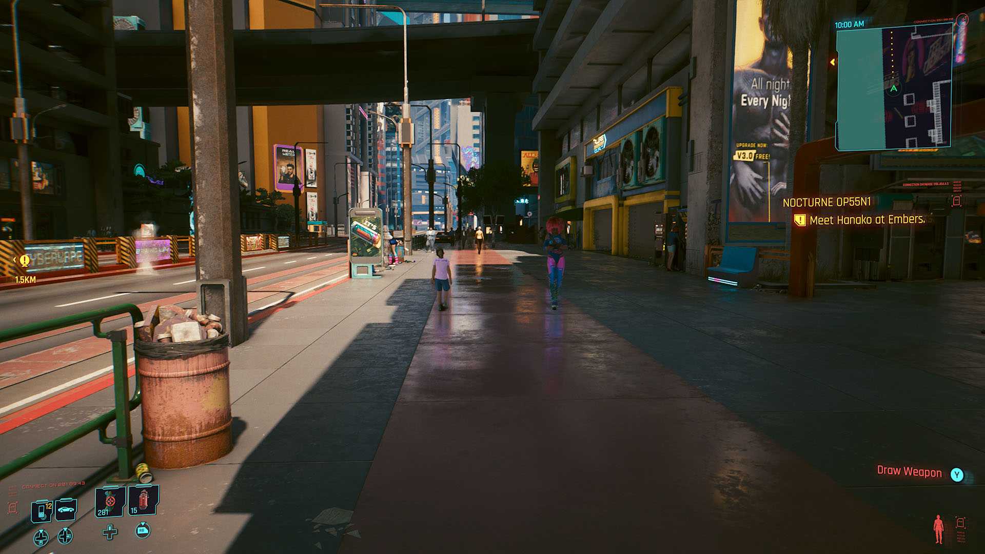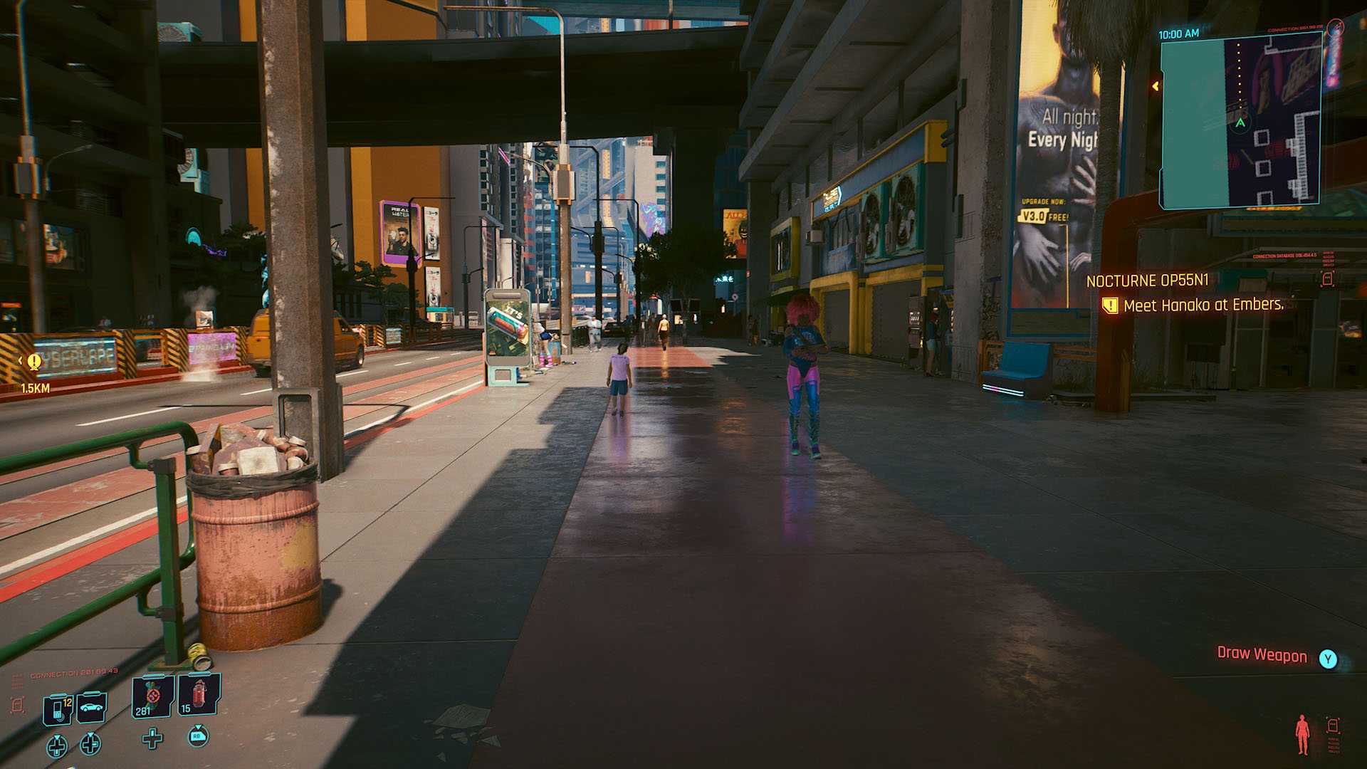 Стоит отметить, что количество NPC на улицах возросло. Найт-Сити всё ещё нельзя назвать густонаселённым мегаполисом, однако разница с прошлой версии ощутимая. В самых популярных местах вроде квартиры Ви бродят прямо-таки толпы, да и на остальных улочках тачек и народу стало побольше.