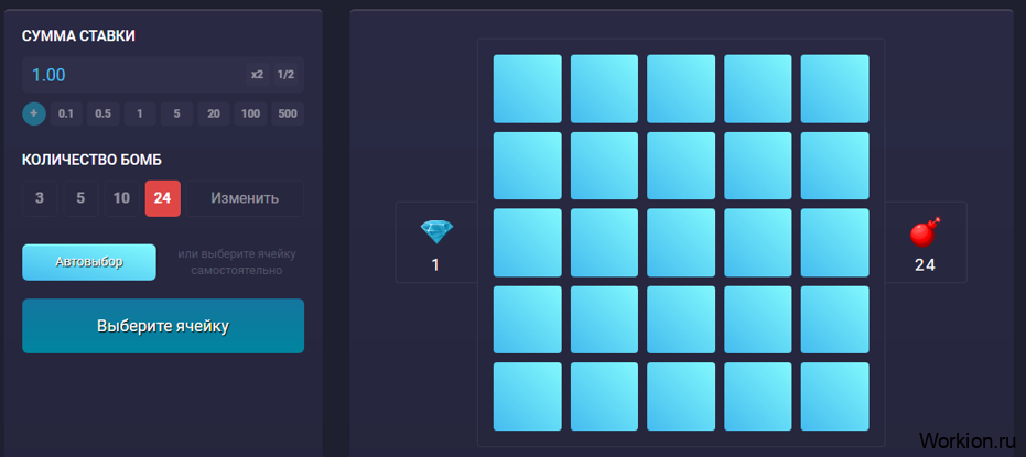 Шансы на выигрыш небольшие, зато не придется долго фармить. В случае выигрыша получаешь коэффициент х23.74. Сумму ставки лучше устанавливать минимальную. Тем, кто не хочет так сильно рисковать, лучше выбрать 5 бомб и выходить из игры, открыв 4 ячейки. В этом случае выигрыш составит х2.48, стратегия тоже рабочая.
