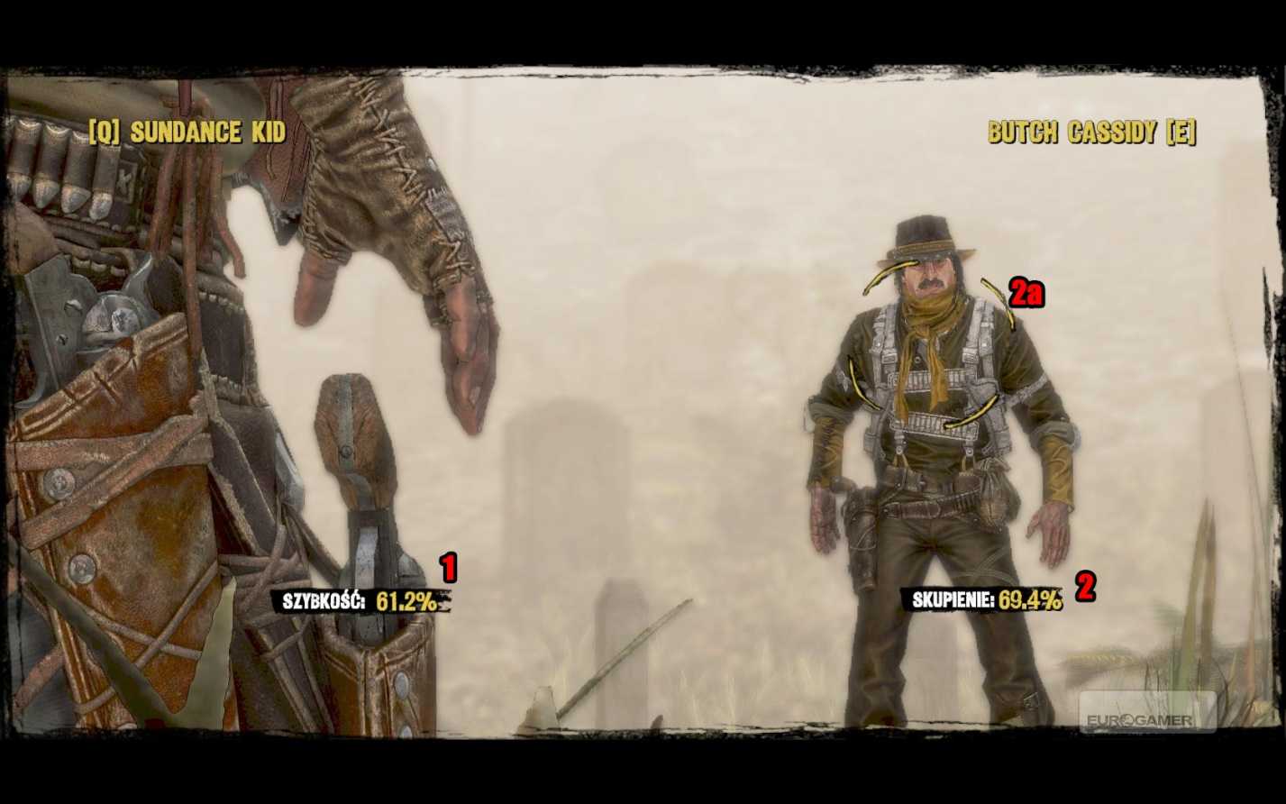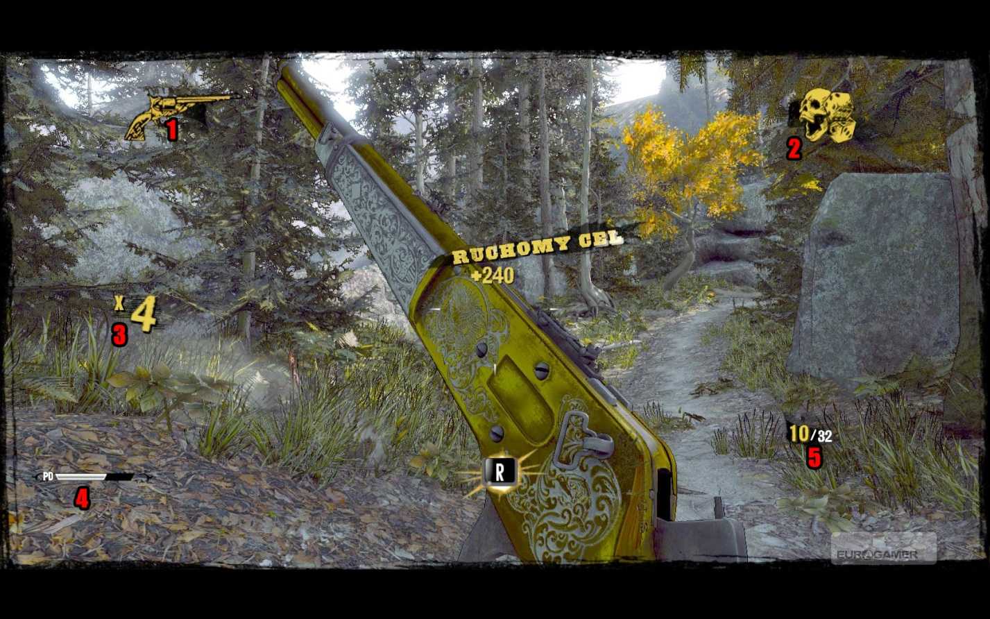 1 — Концентрация — этот индикатор показывает степень зарядки нашей концентрации. Чем больше пистолет заполнен, тем дольше мы можем использовать этот навык. Заполнит индикатор можно при стрельбе по противникам. Чтобы активировать эту способность, нажмите клавишу «Q». Концентрация замедляет время, что позволяет быстро уничтожать даже большие группы врагов. Используя это умение, враги выделяются красным цветом, что также полезно для быстрого обнаружения.