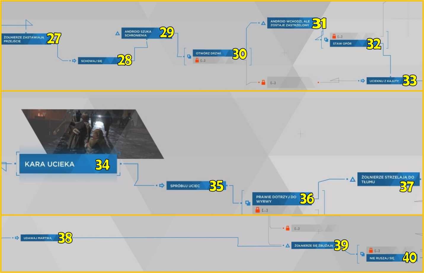 На другой стороне комнаты андроид будет искать укрытие (29). Откройте дверь (30), чтобы впустить его. По общему признанию, андроид придет, но будет застрелен (31). Тогда Кара должна будет противостоять (32) солдату. Выиграв сцену QTE, стреляйте в противника и сбегайте из кабины (33).
