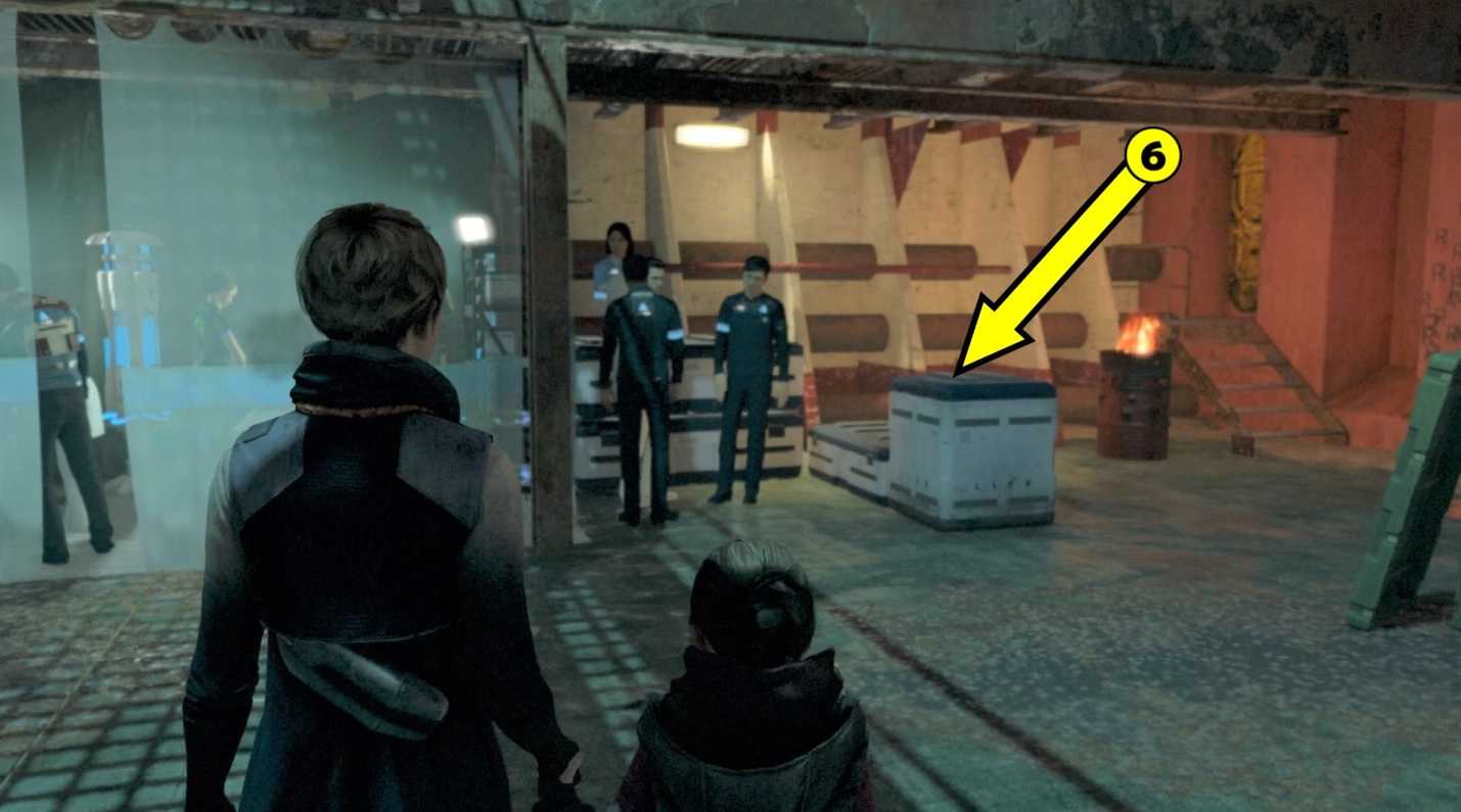 Когда вы доберетесь наверх, поговорите с Маркусом (Встретьте Маркуса — 11), который сидит в комнате. Затем спуститесь и вернитесь к Алисе (12). На пути к девушке вы увидите ребенка-андроида (13). Поговорите с Алисой (Присоединитесь к Алисе 14). Обнимите ее (15), чтобы продолжить миссию.
