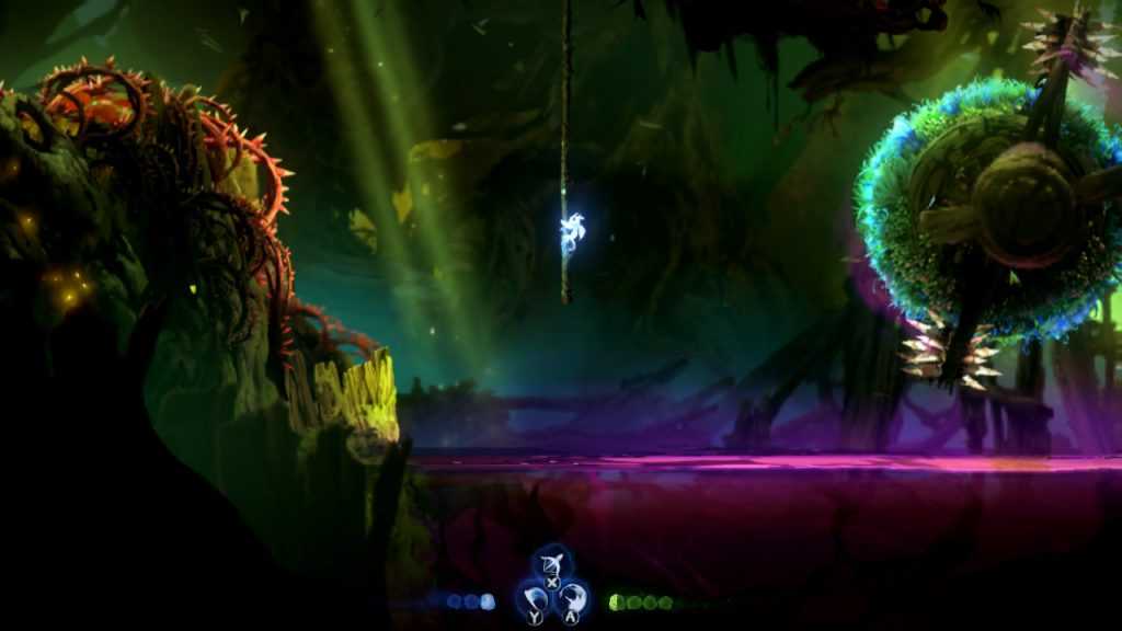 Локации, по которым нам предстоит путешествовать, в своей совокупности напоминают муравейник – это внушительное количество перемежающихся друг с другом тоннелей разной степени “загрязненности” всевозможными ловушками. Тут и шипастая поросль прорастает, и вредящая здоровью жидкость плещется, а тяжелые механизмы так и норовят раздавить нашего Ори или усложнить ему жизнь за счет перекрытия доступа к очередному проходу. Периодически нам придется разгадывать интересные головоломки, где придется проверять свою скорость реакции, умение правильно прожимать кнопки и немного смекалочки.