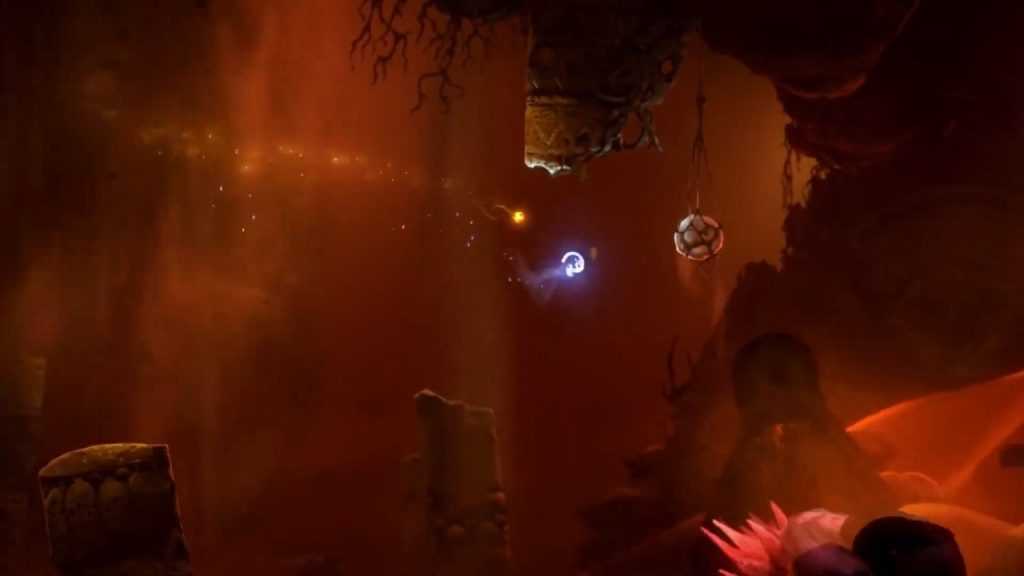 Двигайтесь налево, ломайте дерево и карабкайтесь по синему мху на потолке. Там находится ценный осколок духа, который уменьшает получаемый урон. Возвращайтесь. По трухлявому дереву поднимайтесь наверх. Бегите направо, пока не начнется кат-сцена. Затем бегите направо и спускайтесь вниз. Прыгайте по бамбуковым стеблям, чтобы перелететь через шипы. Забирайтесь на мост, раскачивайтесь и взлетайте еще выше.
