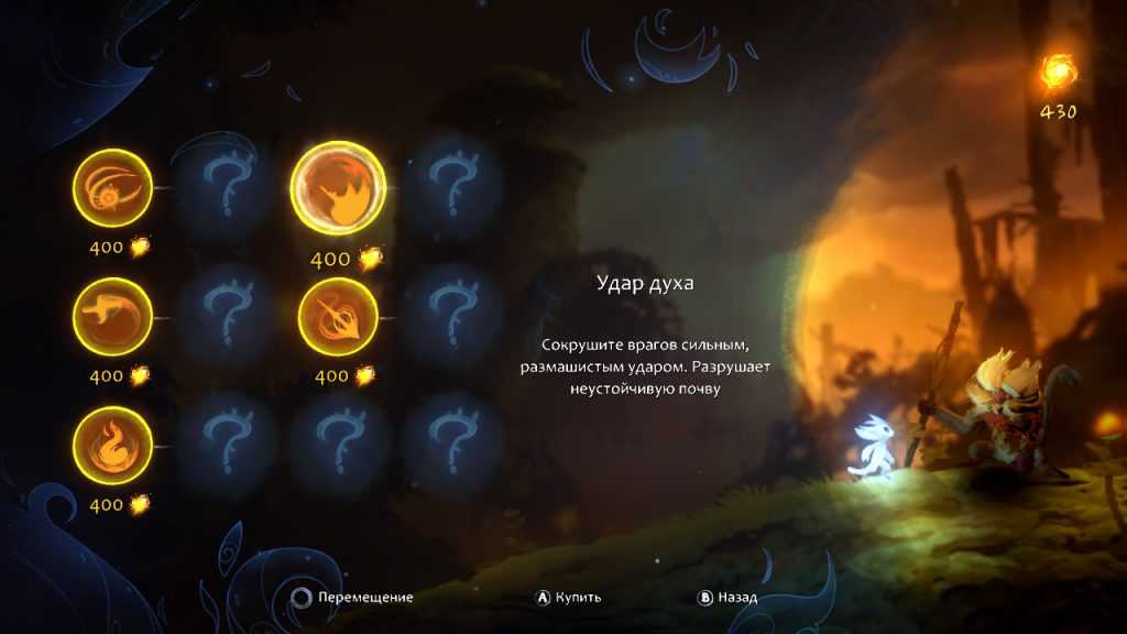 Но не пугайтесь сложностей – это все часть приключения. Тем более что лес Нибель настолько красив, что заблудиться в нем даже в удовольствие. Когда Ори легко скользит по небу на перышке или прыгает между покрытыми мхом вершинами холмов, он неразрывно связан с природным миром и наделен бесконечными возможностями его исследования – вот и исследуйте. А чтобы блуждать вам было не скучно, разработчики насытили локации множеством врагов, опасных ловушек и испытаний. Особо воспламеняют седалище местные “гонки”, где надо прыгать, карабкаться и всячески паркурить на скорость. Зато если уложитесь в установленные рамки – вам выдадут приличное количество желтых сфер для прокачки.