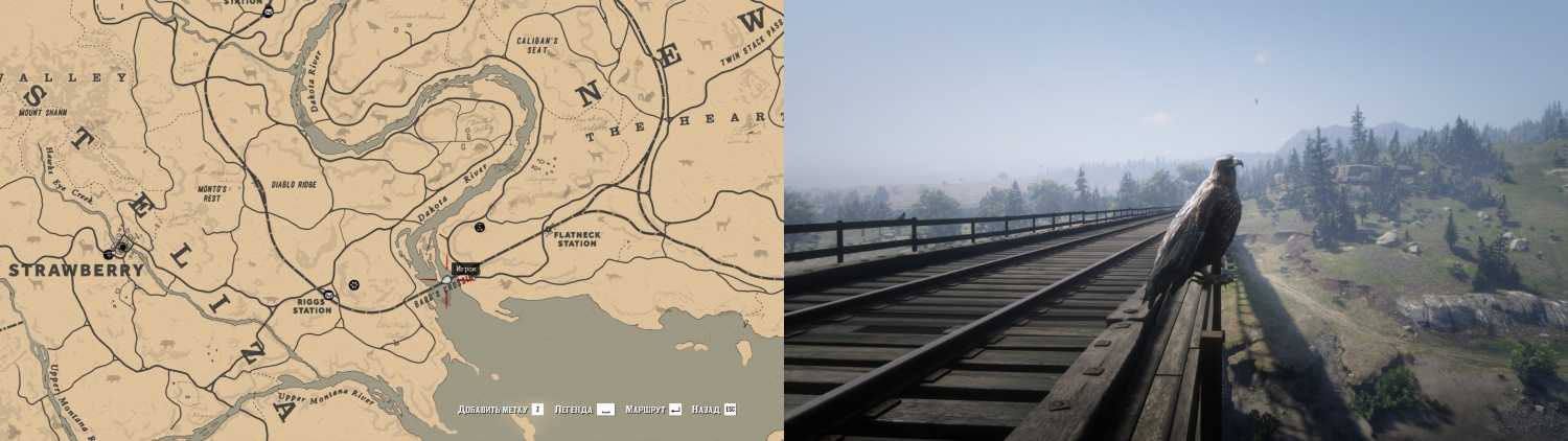 Самый простой способ найти хищных птиц — убить животное/противника и дождаться падальщиков. Другой вариант — приехать на железнодорожный мост к югу от Valentine. В полдень на нем будут сидеть от 1 до 3 нужных нам птиц: гриф, беркут, орлан.