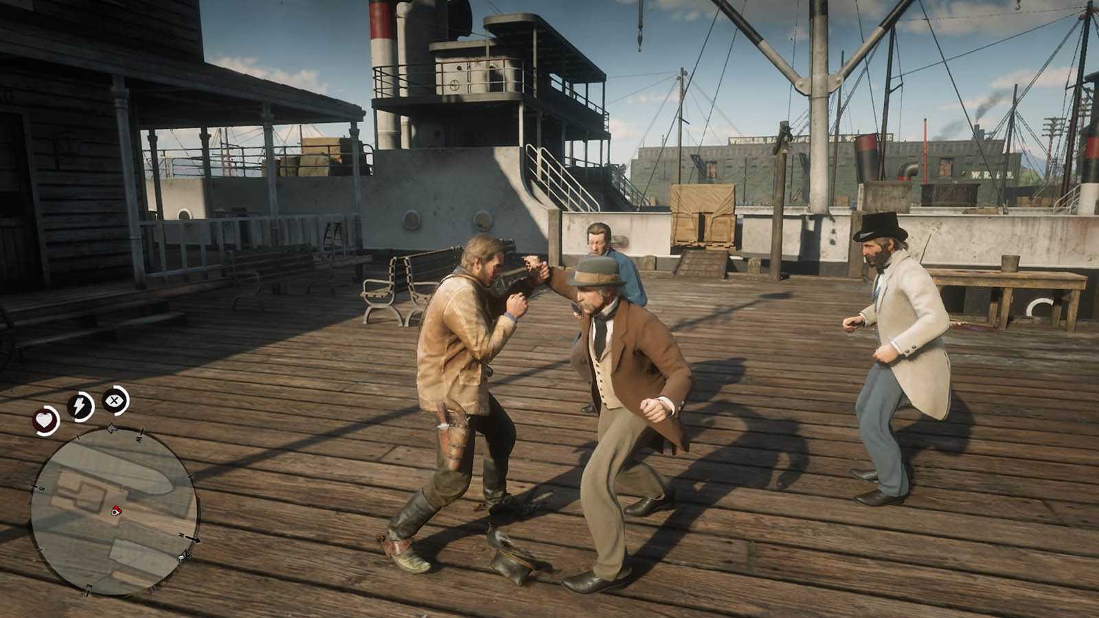 Ваша задача — сопровождать друга по пути в порт. Просто следуйте за Чарльзом, и прямо перед приземлением вы встретите трех врагов. Будьте осторожны, потому что у одного из них есть нож.