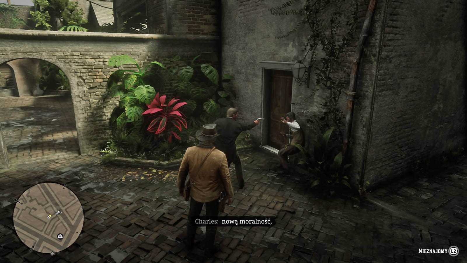Незнакомец в конце коридора. Подойдите к нему, и начнется заставка, которая заканчивается дракой. Победите нескольких врагов, затем идите к Чарльзу, отмеченному желтым на миникарте. Отнесите его в дом друга, чтобы завершить эту часть квеста.
