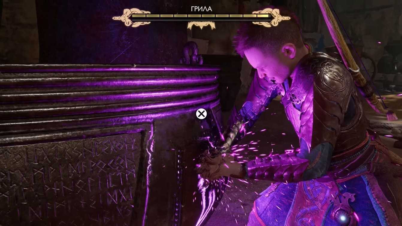Грила — великанша и бабушка Ангрбоды. Чтобы победить ее, нужно уничтожить котел. Полоса здоровья на экране принадлежит именно ему, а не Гриле. Воткните клинок в котел и быстро жмите X. Грила нападет на вас.