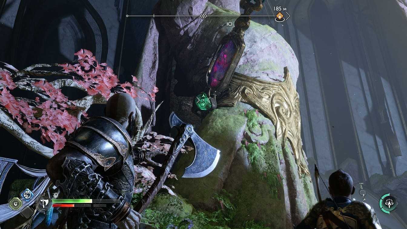 Разрушьте сумеречный камень, чтобы он повредил экран статуи, и сдвиньте ее влево. Возвращайтесь на изначальную позицию и метните топор в кристалл света на щите. Вы откроете проход дальше, после которого запустится кат-сцена.