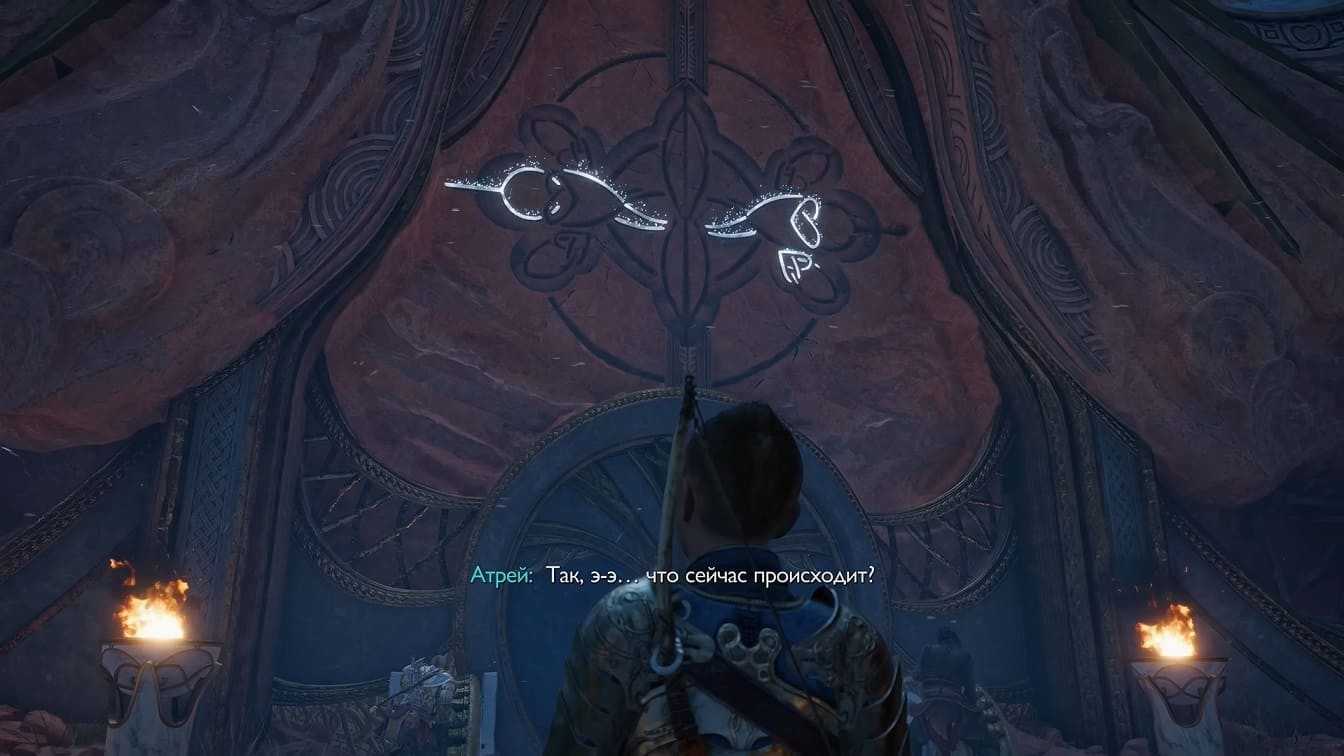 Войдите в храм и подойдите к воротам. Вместе с Тюром активируйте механизмы. Придется слушать указания Атрея, чтобы сделать все правильно.