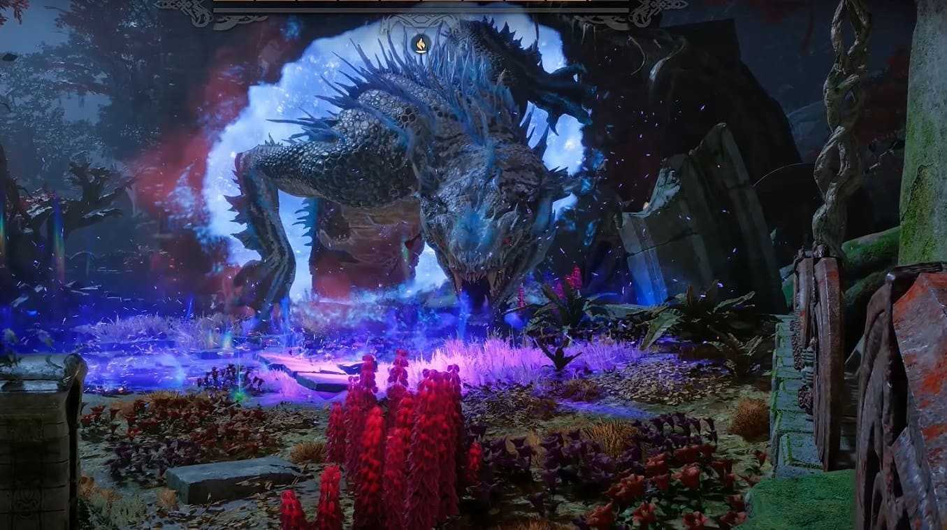 После ролика начнется сражение против босса Нидхегга. На первом этапе босс неподвижен, но отходить от него опасно — атаки дальнего боя нельзя заблокировать, поэтому уворачивайтесь и атакуйте в ответ. Продолжайте бой, пока не появится подсказка с добиванием.