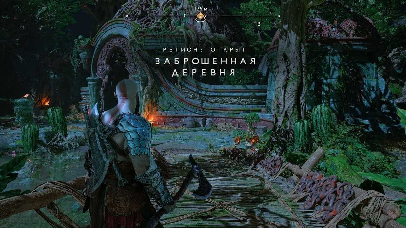 Войдите в здание и спуститесь по канатам в новую локацию. Зачистите внутренний двор от противников. Отправляйтесь дальше. Когда увидите синий туман, не заходите в него. Бросьте Левиафан в тотем с черепами, чтобы заморозить яд. Перед тем, как призвать топор, сначала покиньте территорию с туманом.