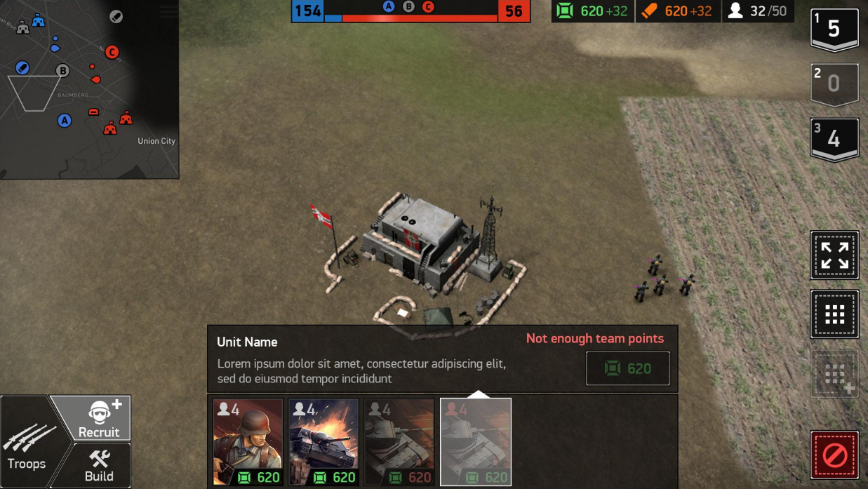 Этот вариант оказался нежизнеспособным. Найм юнитов — суперчастое действие, требующее от игрока постоянно двигать камеру с поля боя на базу и обратно, что сильно раздражало и отвлекало.