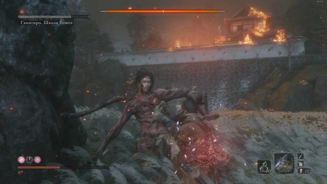 Большая часть его атак (за исключением комбо и еще пары мувов) сбиваются обычными атаками, а потому лучшее, что можно сделать, это наседать на него, не давая ему самому уйти в агрессию. В самом начале боя он ВСЕГДА делает одну-две заряженных атаки своим клинком бессмертных, чем обязательно нужно воспользоваться, чтобы забежать ему за спину. Доджатся эти атаки очень просто, а потому каждый раз, когда он их использует, у вас появляется отличный шанс провести по нему серию атак со спины. Одна из самых опасных атак Гэнитиро – прыжок. Сам по себе он сложности не представляет, поскольку парируется, однако то, что последует за ним, нужно научиться контролировать. Всего варианта может быть три: непарируемый выпад (применяем микири), непарируемый удар с разворота (прыгаем Гэнитиро на голову) и парируемый удар с разворота (я по привычке также совершал прыжок, как и в предыдущей атаке, чтобы меньше путаться). Определять, что именно он собирается делать, нужно быстро, но научиться этому несложно – после пары раз обязательно начнет получаться. Другая опасная атака – длинная серия ударов с самых разных сторон, которая заканчивается выпадом (если предыдущие атаки спарировать), схожая с тем, что он использовал во время боя на крыше. Если нет проблем с реакцией, то просто парируем все его атаки, а на выпад делаем микири, но не сразу, т.к после комбо он делает выпад с небольшой задержкой и сделав рывок в его сторону сразу, можно словить шальной ваншот от дурачка Гэнитиро. Если с реакцией проблемы – делаем рывок назад после первых двух ударов и пережидаем всю серию, готовясь подбежать и нанести удар после ее окончания. Последняя заслуживающая внимания атака – когда Гэнитиро пытается забежать вам за спину и провести непарируемую атаку. Доджится простым рывком назад.
