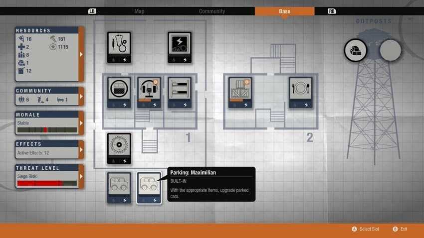 Вы можете увеличить статистику своей базы, используя аванпосты в правой части экрана. Если вам нужно больше кроватей, вы можете занять дом, а если вам нужен постоянный поток топлива, вы можете занять заправочную станцию. По мере прохождения игры вы будете сталкиваться с уникальными и чрезвычайно мощными аванпостами, которые могут дать революционные преимущества. Например, на карте я обнаружил электростанцию, которая будет обеспечивать электричеством мою базу. Наличие силы повышает боевой дух, а также является требованием для некоторых улучшений более высокого уровня. Вы можете получить некоторые из этих более мощных функций с помощью модификаций предметов, найденных или созданных.