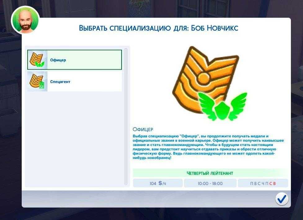 С другой стороны, офицерская ветвь военной карьеры связана с продвижением по формальным чинам военной структуры и выполнением действий, типичных для военного офицера. Симы в этой ветке будут работать с 10:00 до 18:00, и им нужно будет сосредоточиться на навыке «Харизма», чтобы продвигаться вперед.