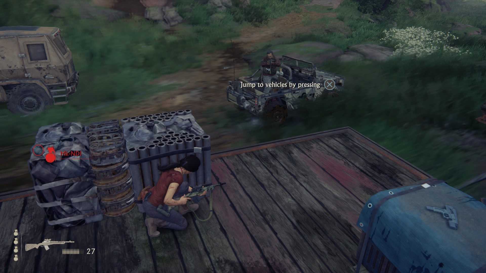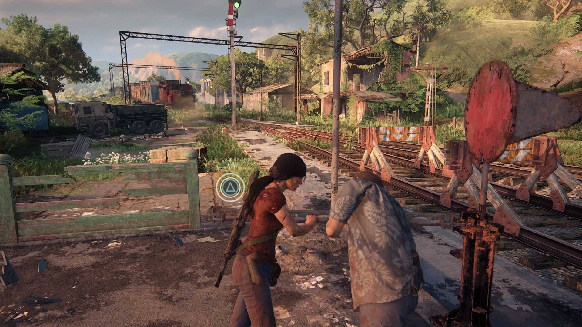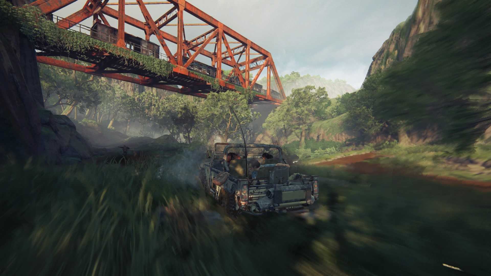 Помогите Надин открыть другую металлическую дверь впереди. Таким образом вы дойдете до двигателя. Поверните направо к запертой двери. Спрыгните вниз, повисните на правой стороне, чтобы добраться до крыши и двери на верхней стороне поезда. Спрыгивайте на джип справа после перестрелки с солдатами. Двигайтесь вправо, чтобы добраться до выключателя. Следуйте за Сэмом и помогите ему нажать на переключатель.