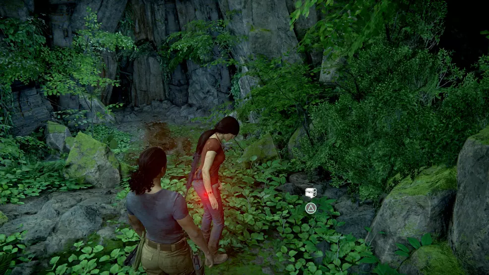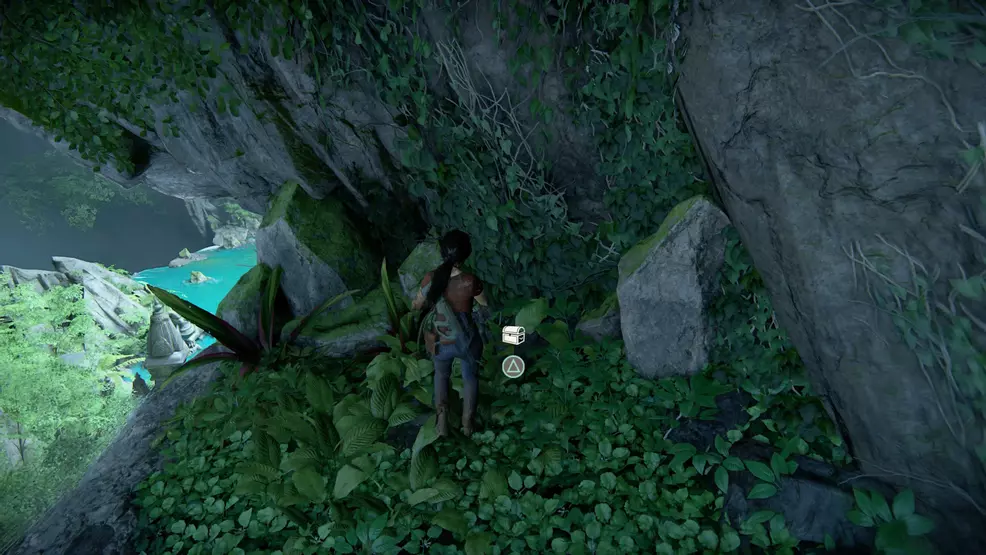 Similar moss-covered stones are how players can reach the 63rd treasure, the Peacock Nut Cutter. To reach this treasure, instead of using the stones to climb up the wall a bit later on, use them to climb down to a hidden ledge. Afterwards, continue pushing the story forward until reaching the point when Sam pushes a crate down and then pulls Chloe and Nadine up. Run into the cave here and follow the tunnel to the end to find the British Powder Flask.