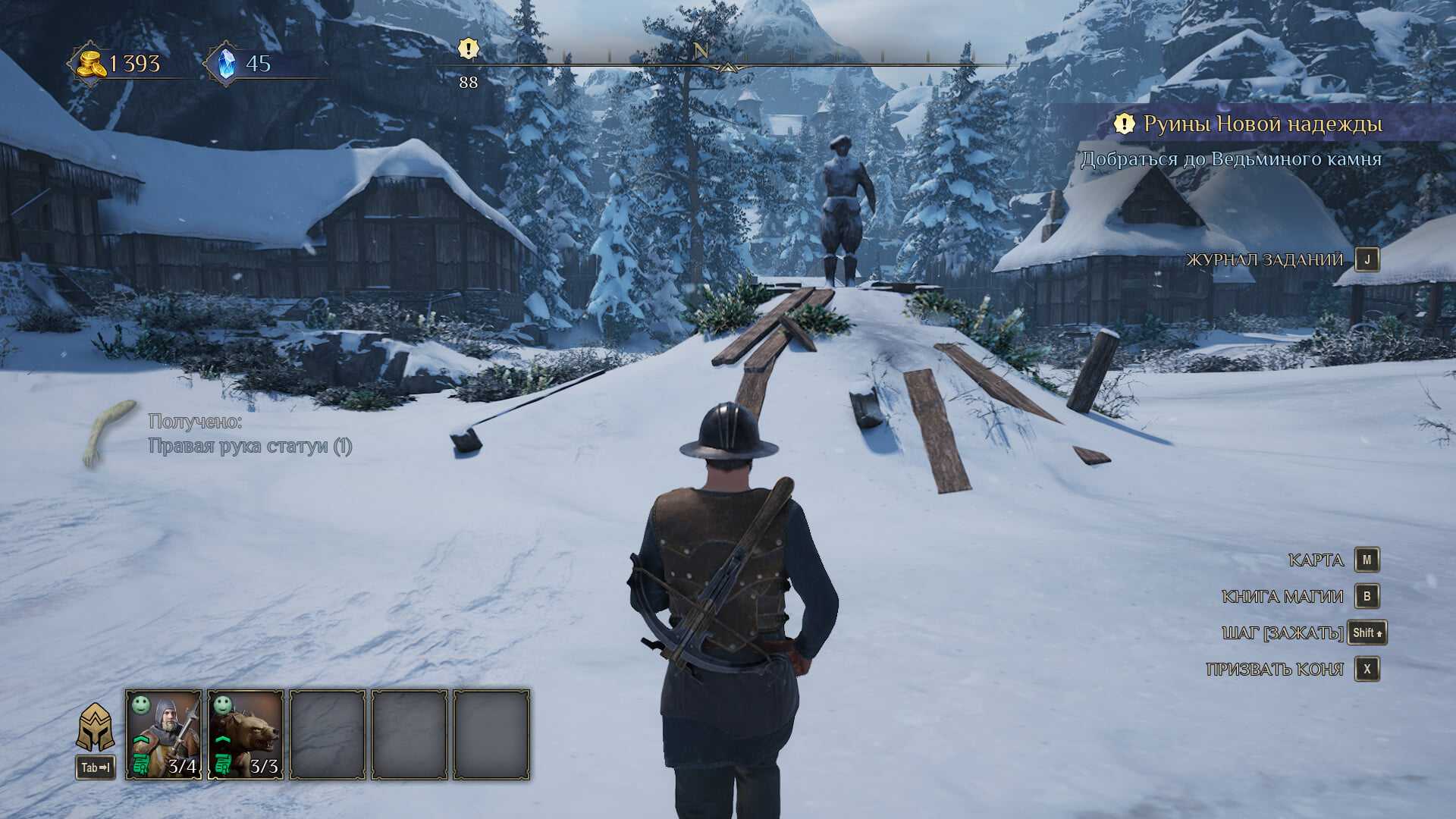 После легендарной победы вы найдете деревню «Новый Тирен». Изучите ее – здесь много ценного лута. В центре поселка подберите правую и левую руки статуи. Установите обе руки, поднимите правую – найдете тайник с драгоценностями.