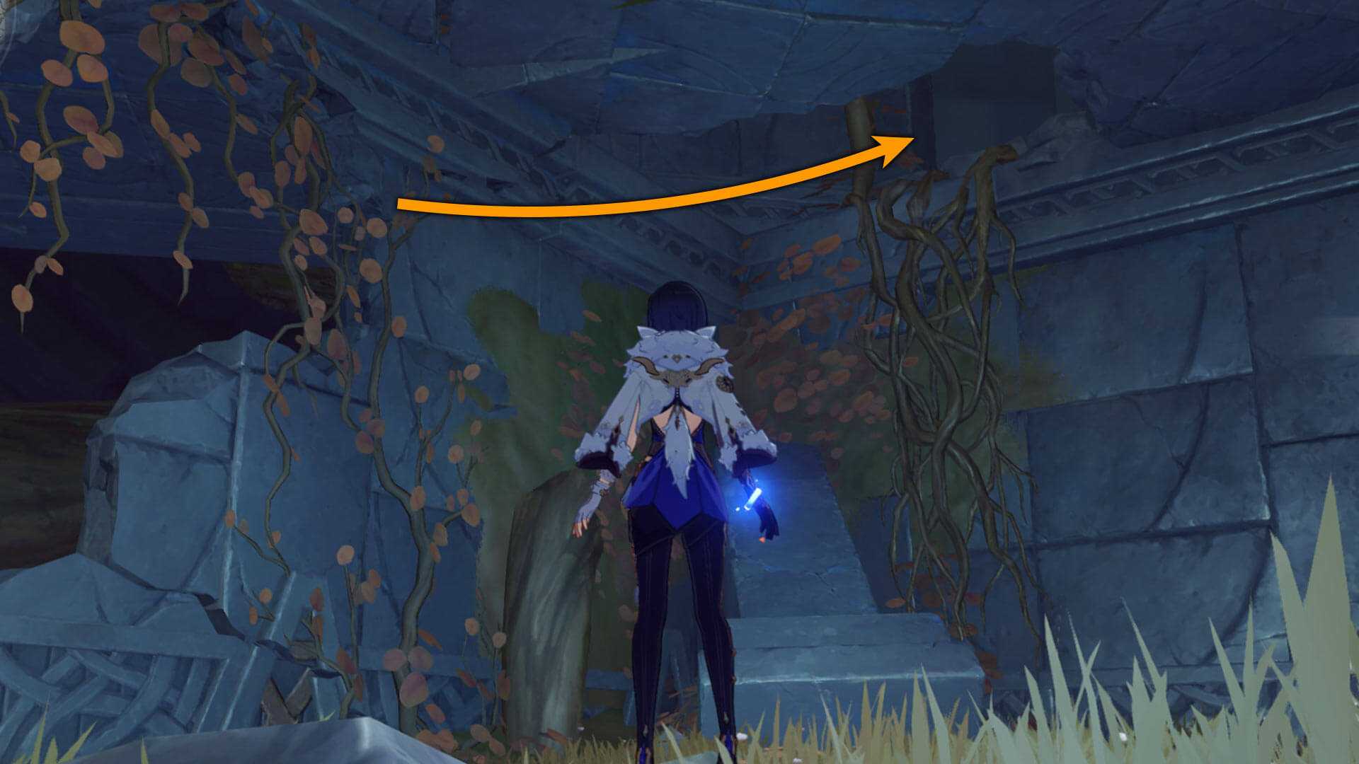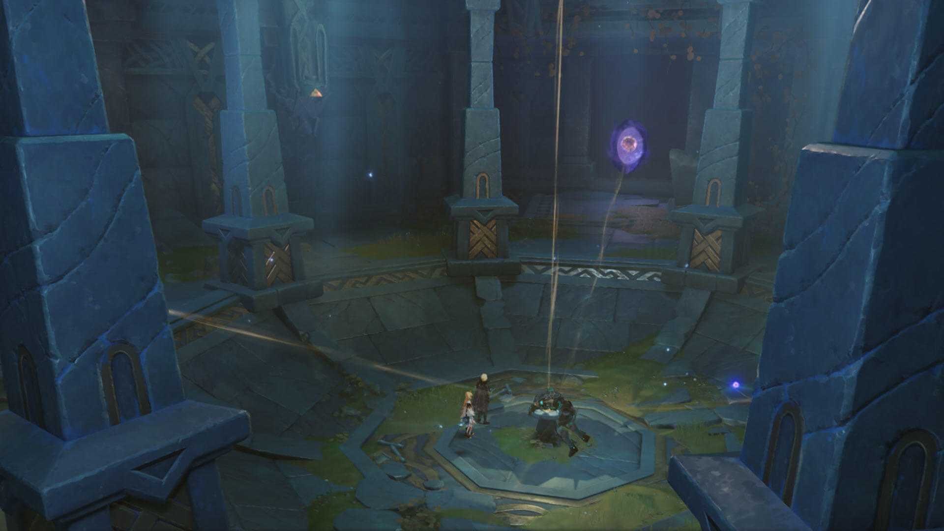 Осматриваем лагерь, где останавливались хиличурлы. Дайнслейф рассказывает, что хиличурлы это бывшие жители нации Каэнри’ах, на которых 500 лет назад было наложено проклятие. Когда они чувствуют, что конец близок, то ищут тихое и темное место, чтобы попрощаться с веками страданий. И это место, где ослабевает действие проклятия, становится их последним пристанищем.