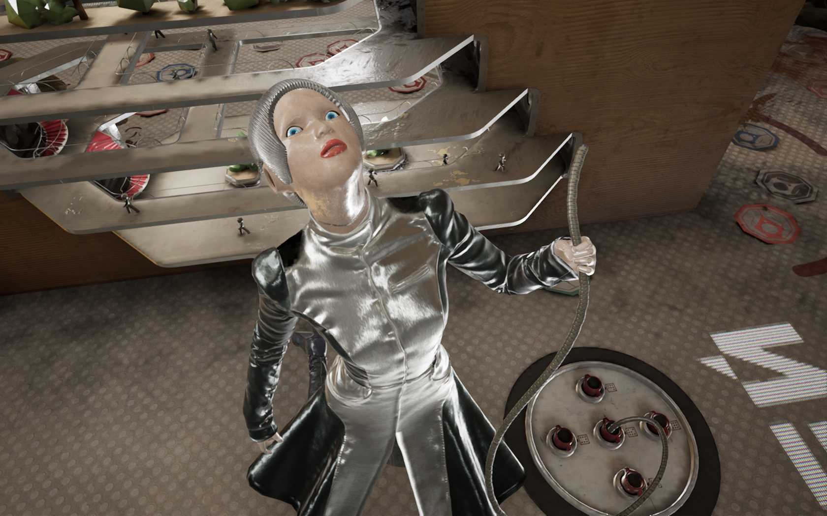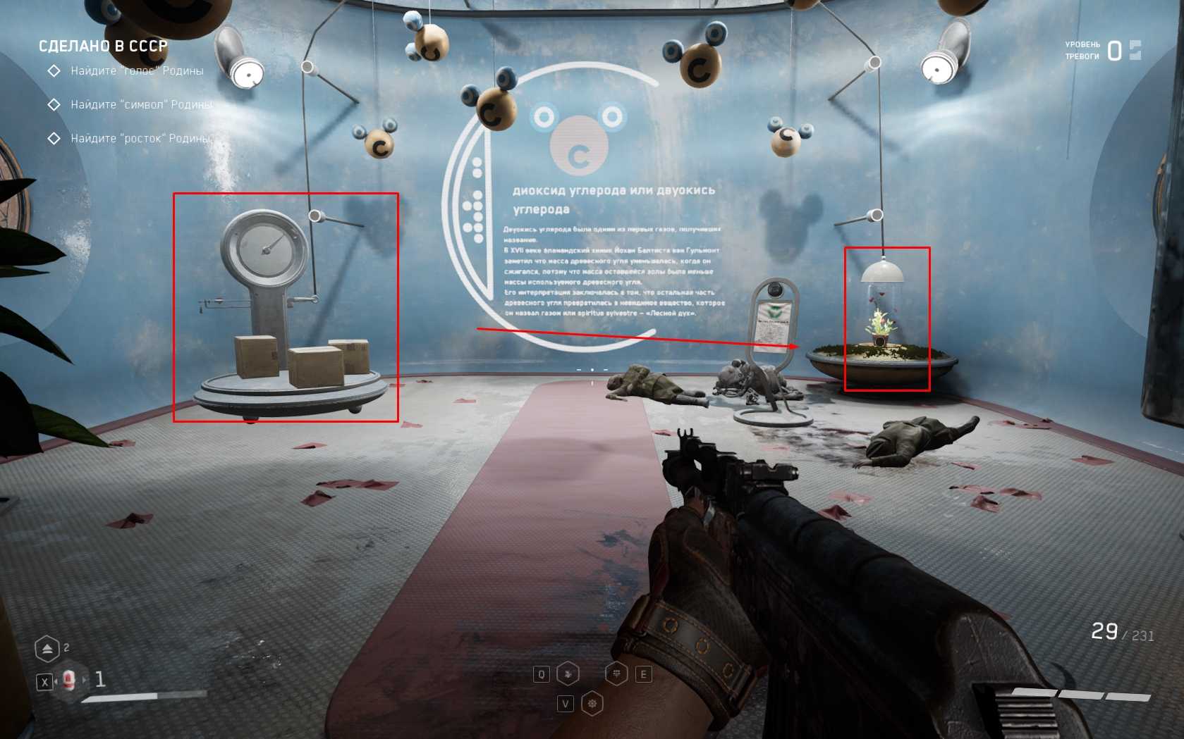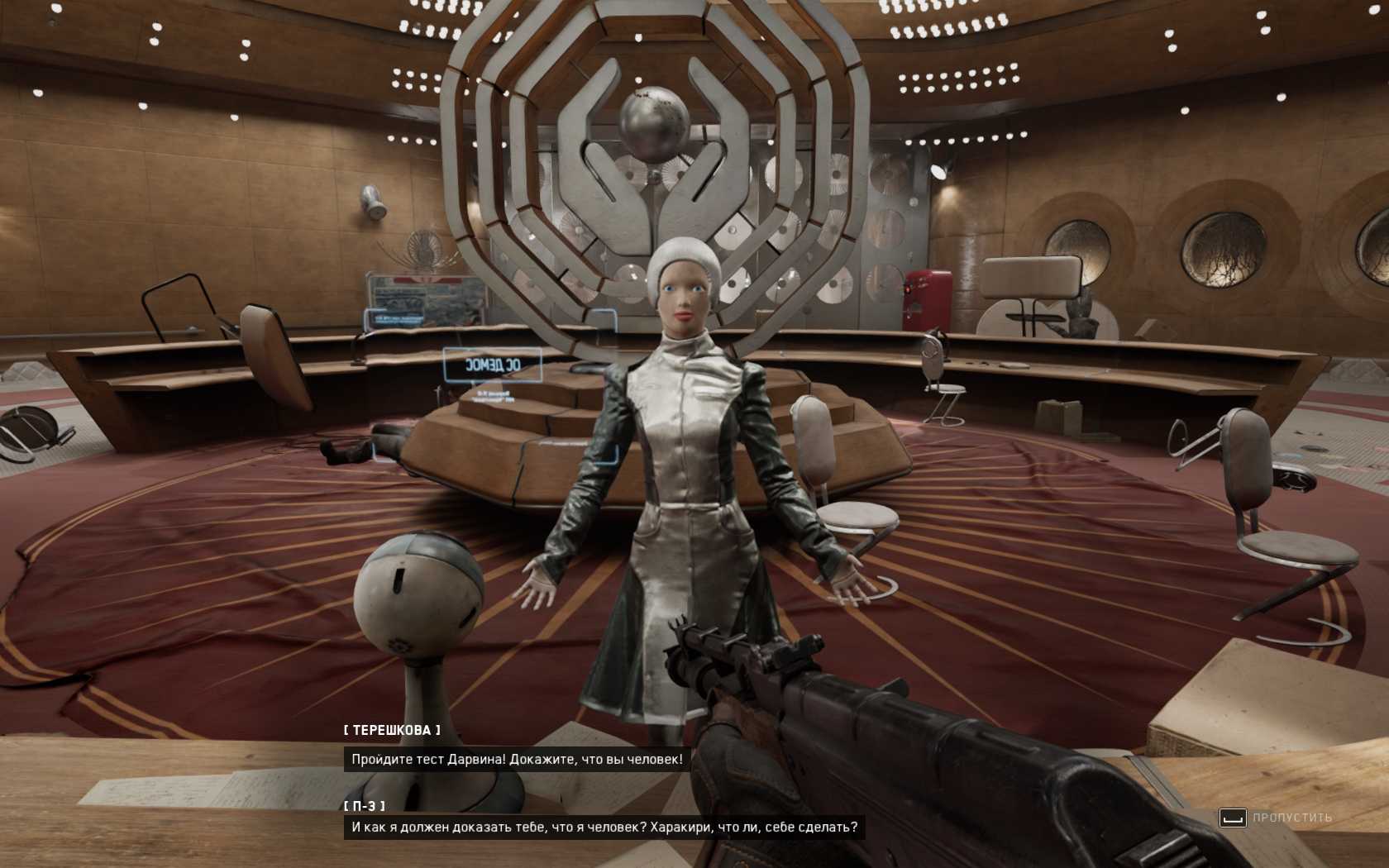 У стойки в зале вас встретит Терешкова. Она не поверит, что главный герой – настоящий человек и откажется активировать режим военных учений. Чтобы доказать ей, что Нечаев не робот, нужно пройти тест Дарвина в Атомик Харт, суть которого – найти три вещи, которые олицетворяют собой искусство, труд и жизнь.