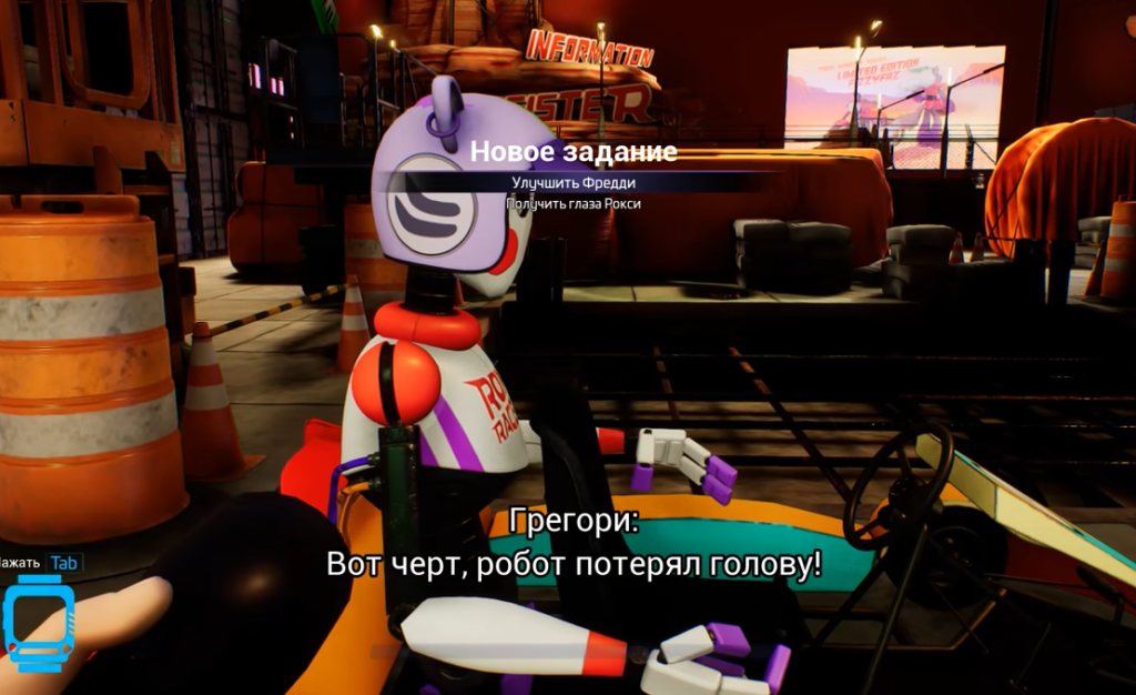 У правой стенки стоит карт с роботом на водительском месте. Но у него нет головы – появляется задание «найти голову бота». Поднимитесь по металлической лестнице и поищите ящики около красной двери. Когда Грегори подойдёт поближе, из одного выскочит бот – у него отвалится голова. После того, как вы её поднимете, активируется новое задание, касательно ремонта головы бота.