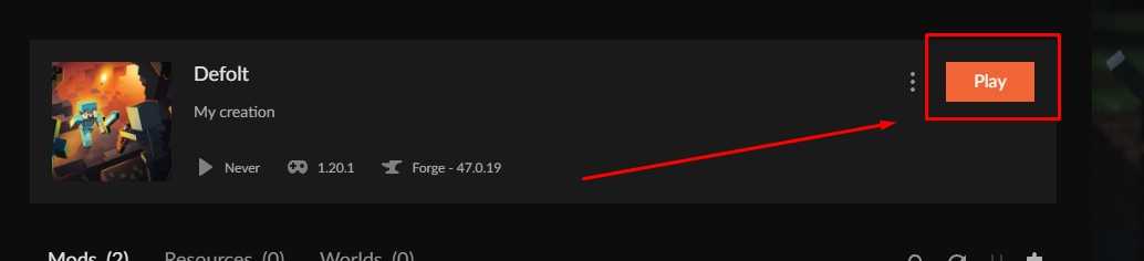 После этого вы можете открыть Minecraft прямо из приложения CurseForge, нажав кнопку «Play». Игра запустится вместе с установленными вами модами.