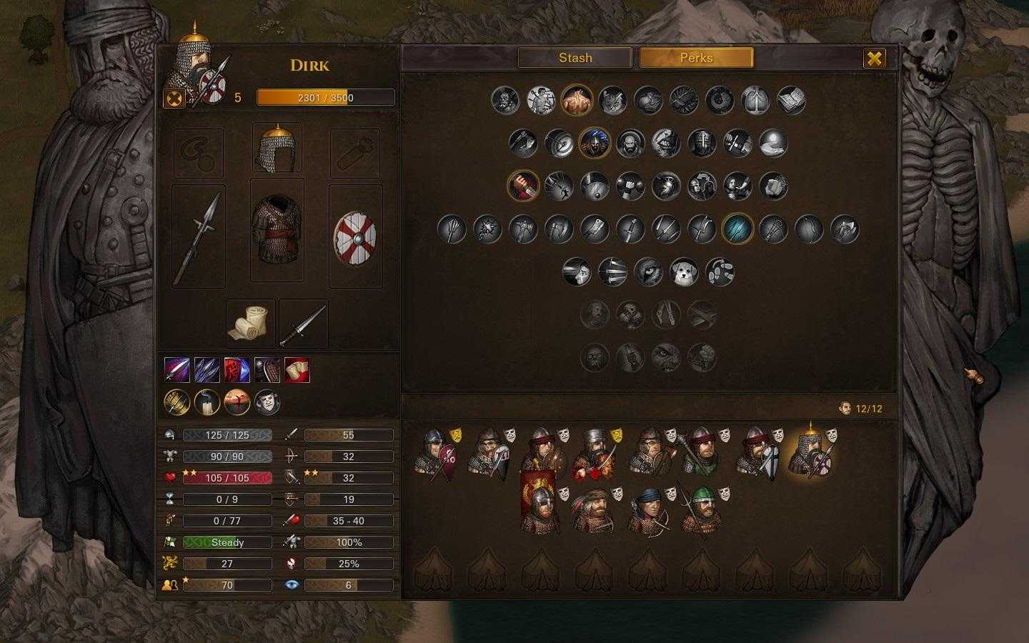 Защита от оружия ближнего и дальнего боя (Melee defense & Ranged defense). Точно такая же история, как и с навыком атаки, только здесь мы можем видеть, против каких типов урона наш боец лучше может защищаться. Эти два навыка тоже можно прокачивать. Для бойцов ближнего боя советую стремиться к балансу между этими двумя параметрами, а вот лучникам и арбалетчикам защита от атак ближнего боя, в идеале, вообще не нужна. Лично я всегда выстраиваю своих бойцов так, чтобы до них просто никто не мог добраться.