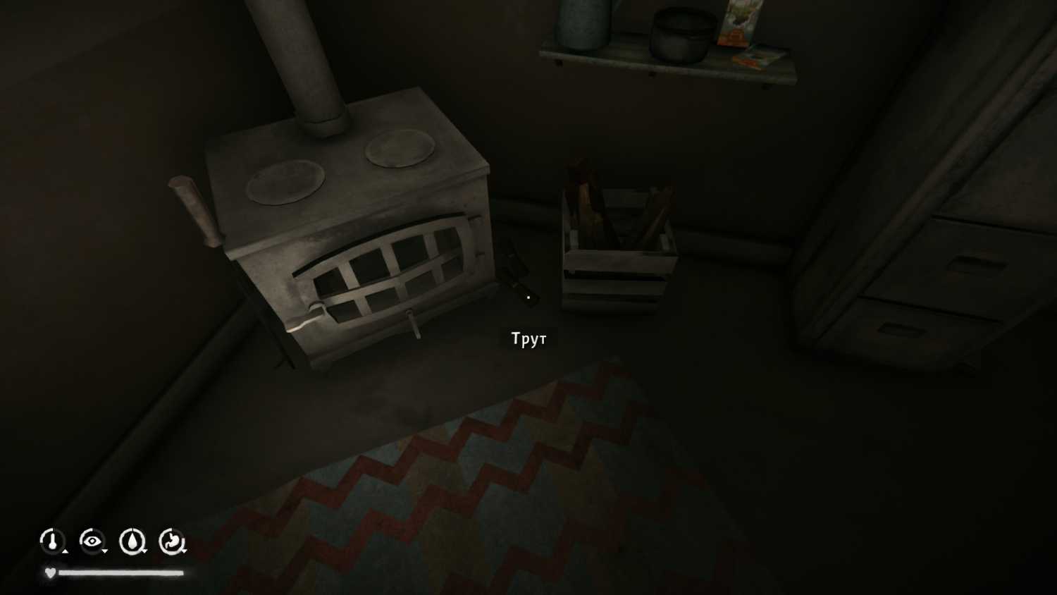В углу комнаты возле печки берем трут и дрова, а затем разводим огонь.