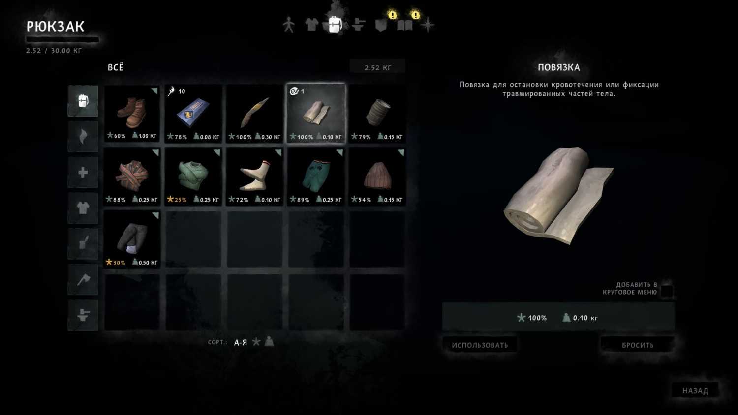 Сразу после этого заходим в инвентарь и используем бинты, чтобы остановить кровотечение.