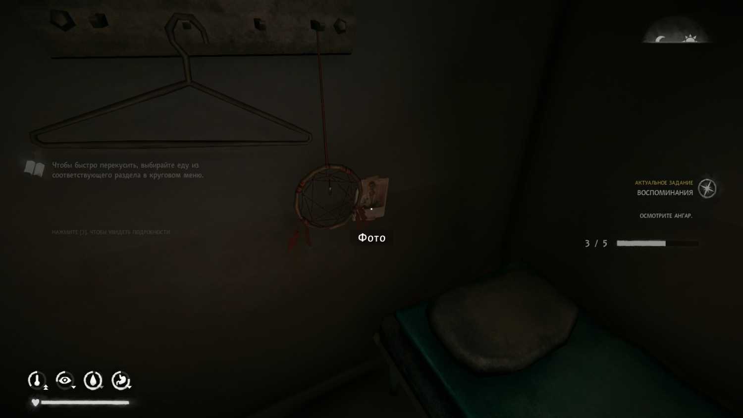 Далее осматриваем остальное – свою куртку и раковину у стены (возле нее забираем травяной чай). Затем идем в спальню, на полке забираем шоколадку, затем смотрим на фотографию, висящую у изголовья кровати.
