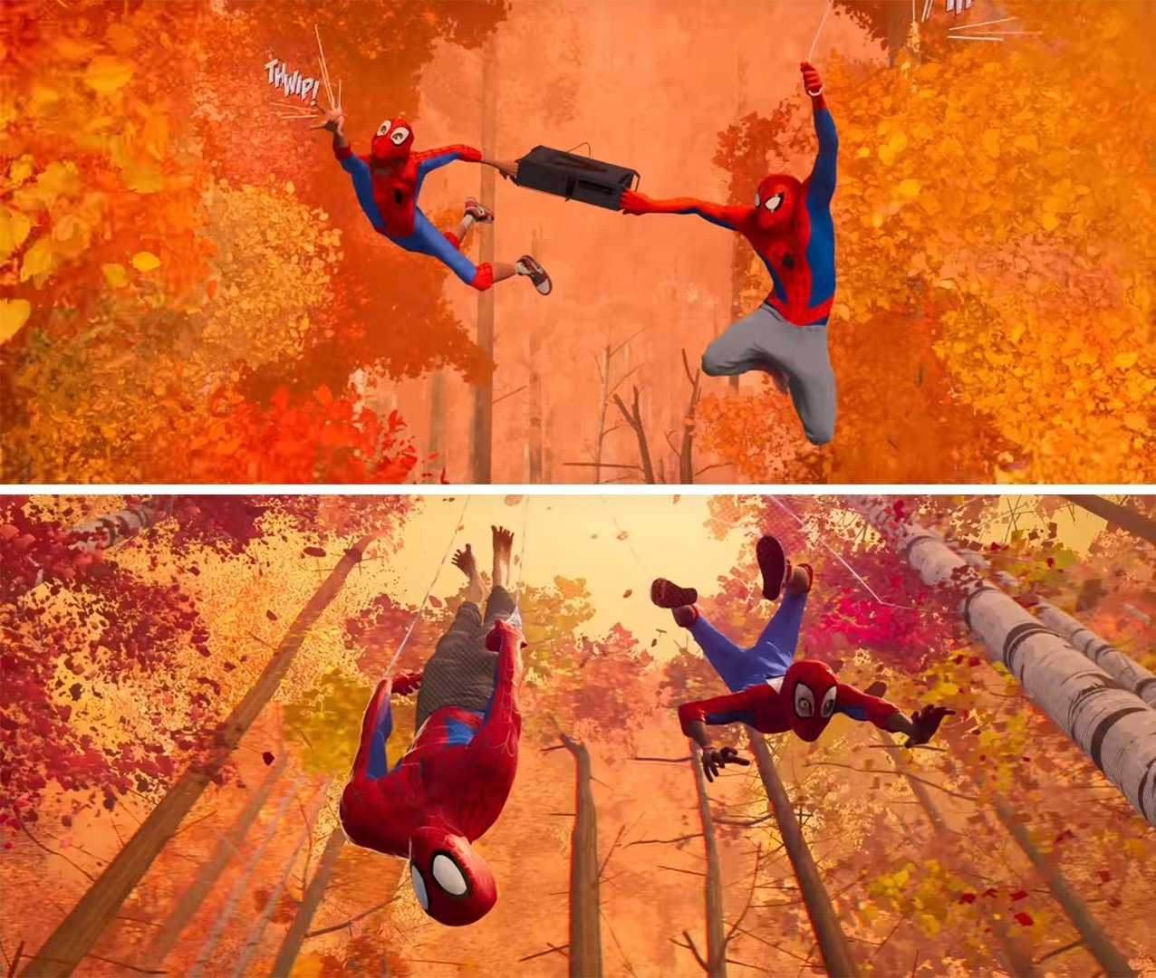 То, что сделали три режиссера — Боб Персичетти, Питер Рэмзи и Родни Ротман — выше всяких похвал. Достаточно мельком взглянуть на ту же сцену в лесу. Когда Питер Б. Паркер учит Майлза раскачиваться на паутине, оба героя, держа в руках системный блок, летят вперед. Это движение быстрое и энергичное, но в то же время между Пауками идет неторопливый разговор, который не подходит ситуации. Поэтому спереди и сзади их окружают желто-оранжевая листва, которая почти сливается в единый фон, скрывая перспективу.