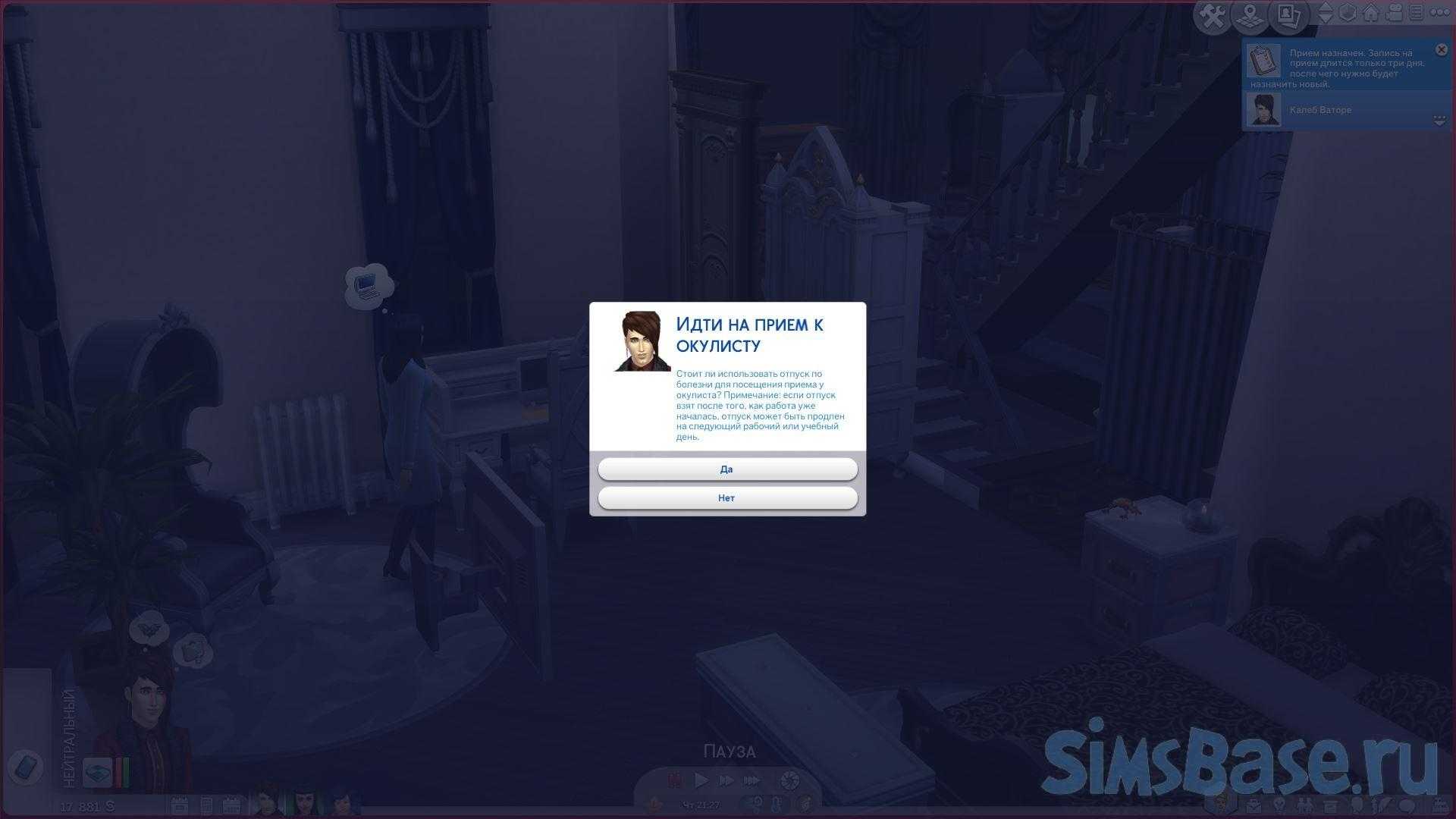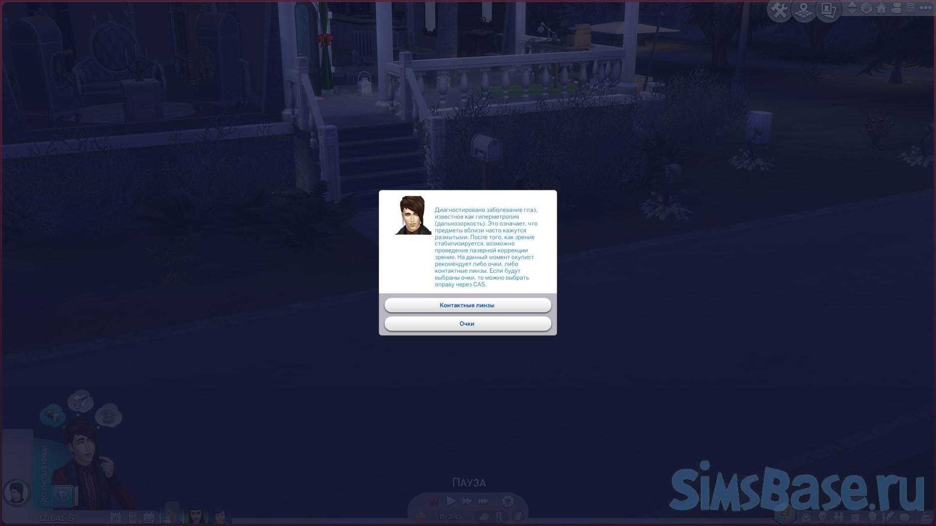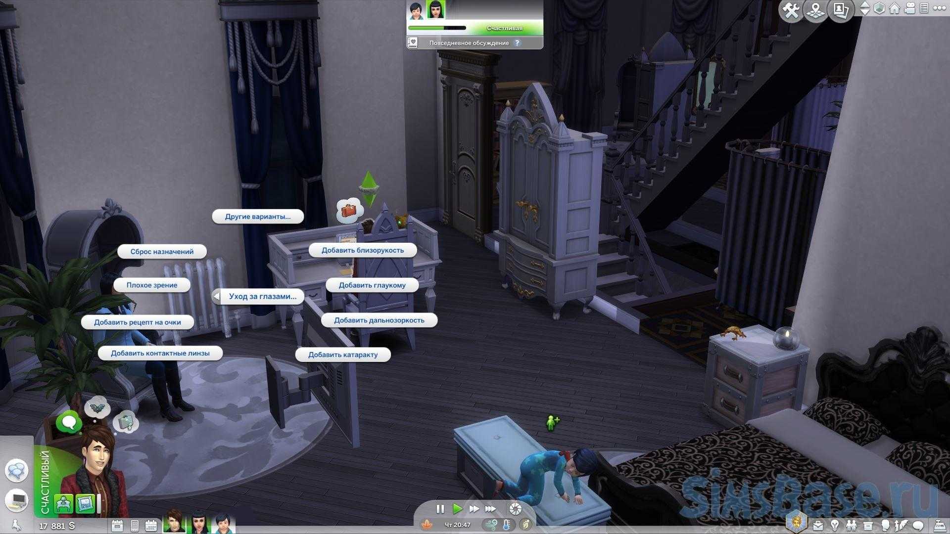 Глаукому можно лечить (но не вылечить) глазными каплями, доступными при нажатии на Сима (анимации закапывания глаз в моде нет – вообще у автора её нет).