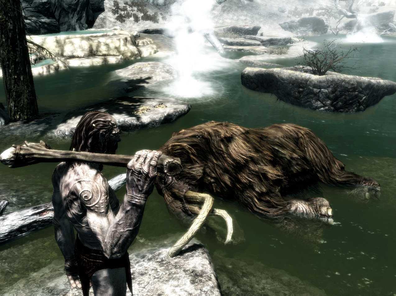Если вам случится найти одинокого мамонта, прогуливающегося по пастбищу, вы можете применить простую и безотказную тактику, чтобы уничтожить его без лишних проблем. Сражаясь с мамонтами, имейте в виду, что они ни за что не войдут в воду, не станут переправляться через ручьи и забираться на скалы. Ну и прежде всего, конечно, они не слишком быстрые. С помощью простой комбинации легкой брони, лука и стрел вы можете стрелять в мамонта, пока он не подойдет достаточно близко. Вам достаточно вовремя и расторопно отступать, чтобы даже в легкой броне (даже без брони совсем) не бояться этих мохнатых слонов. Вы также можете подняться на высокую точку, до которой мамонт не сможет добраться. Как только монстр начнет разворачиваться и уходить, просто снова начните стрелять. Вы можете повторять это, пока не убьете его.