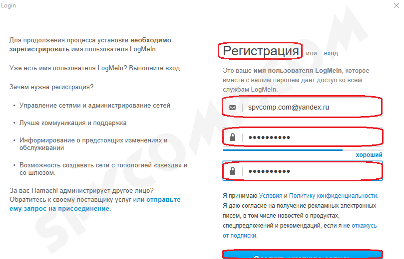 10. Откроется окно регистрации Hamachi. Если вы уже регистрировались, то укажите свои данные. Если нет – то перейдите на вкладку Регистрация, введите свой адрес электронной почты и придумайте пароль. И нажмите Создать учетную запись (иногда эта надпись не видна полностью).