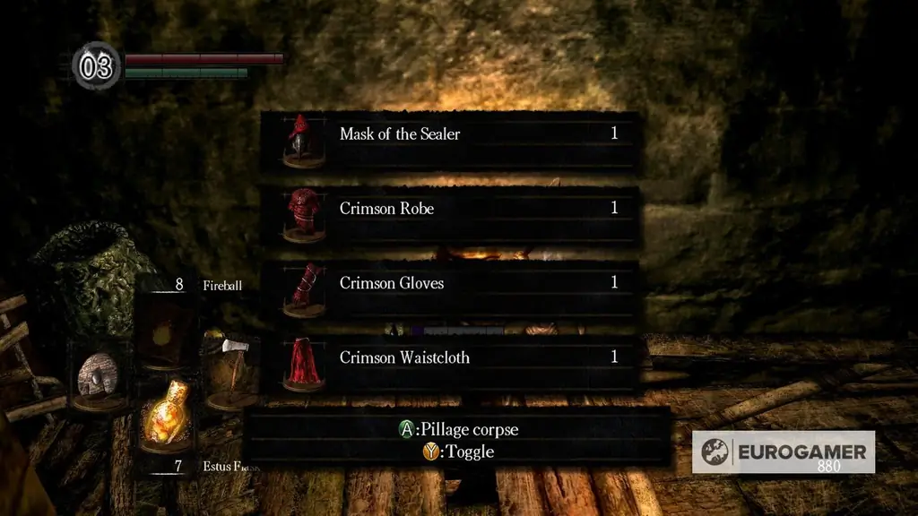 Пройдя вперед, вы найдете Алый сет, который лучше, чем любая стартовая броня. Вы также можете найти здесь исцеляющее заклинание. Теперь можно либо попытаться пройти весь путь обратно или умереть и возродиться в Храме Огня.