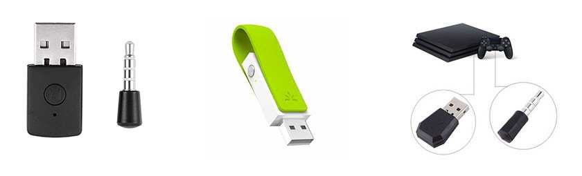 - Через USB. Речь идет о беспроводных наушниках, которые подключаются к консоли через USB адаптер (передатчик) . Так работает большинство наушников, которые как бы были разработан специально для PS4. В том числе фирменные Sony Gold и Platinum.