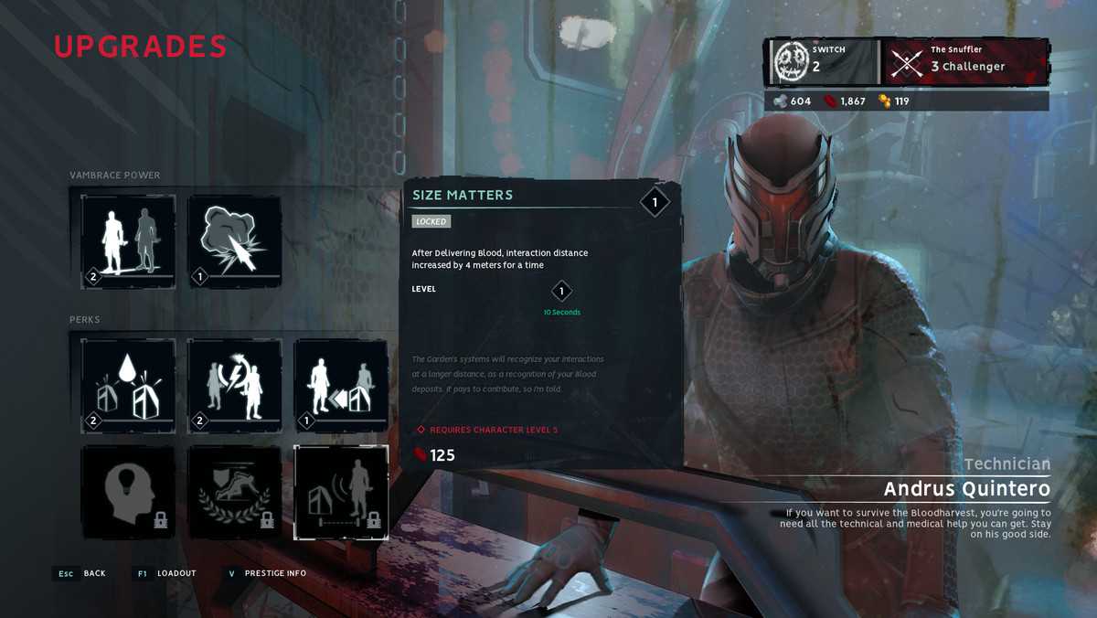 There are three in-game currencies: blood, gold, and iron, which upgrade and unlock characters. Currencies are awarded through in-game actions, like turning in Blood or using a Hunter’s abilities. These challenges encourage players to move through the map and interact with each other, setting up encounters and conflict. Even if I don’t escape, I may have completed a challenge to turn in blood in the first minute of a match, or gained a level by performing well. There’s a steady rhythm of numbers going up and little achievements being filled that form a cadence throughout every individual round.