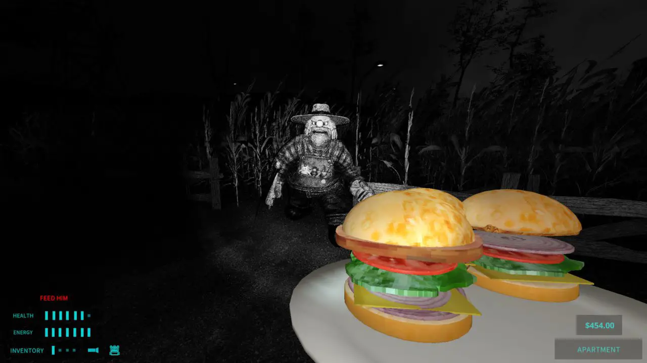 The best strategy to avoid him getting in your way is to let him get as close as possible and then sprint past him. Make him follow you out to the other end of the corn field and sprint back once he’s far enough from the barn. This way you can have some time to build your burgers.