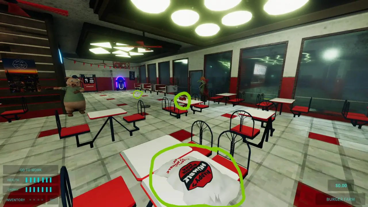 Обычно в видеоиграх на игроков смотрят свысока из-за того, что они играют персонажей-воров. Кража по праву является нарушением закона, даже в цифровой среде большинства видеоигр. Однако Happy’s Humble Burger Farm встряхивает личность обычного вора видеоигр, который хочет ограбить внутриигровой магазин. Магазин в Нью-Элизиан-Сити, который называется «Укради и продай», довольно странный магазин. Здесь игроки могут потратить свои с трудом заработанные в ресторане деньги на предметы, важные для продвижения сюжета, а также продать предметы.