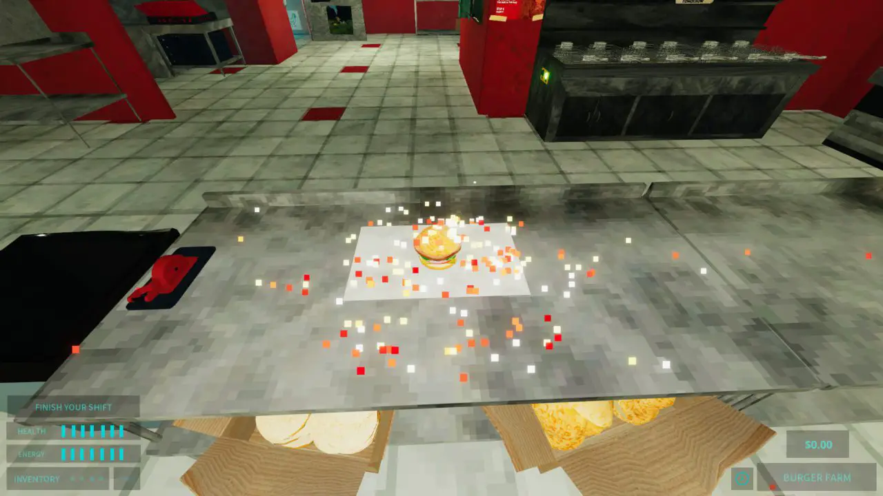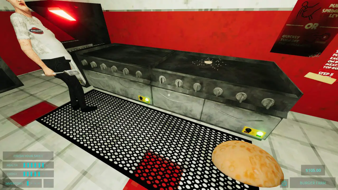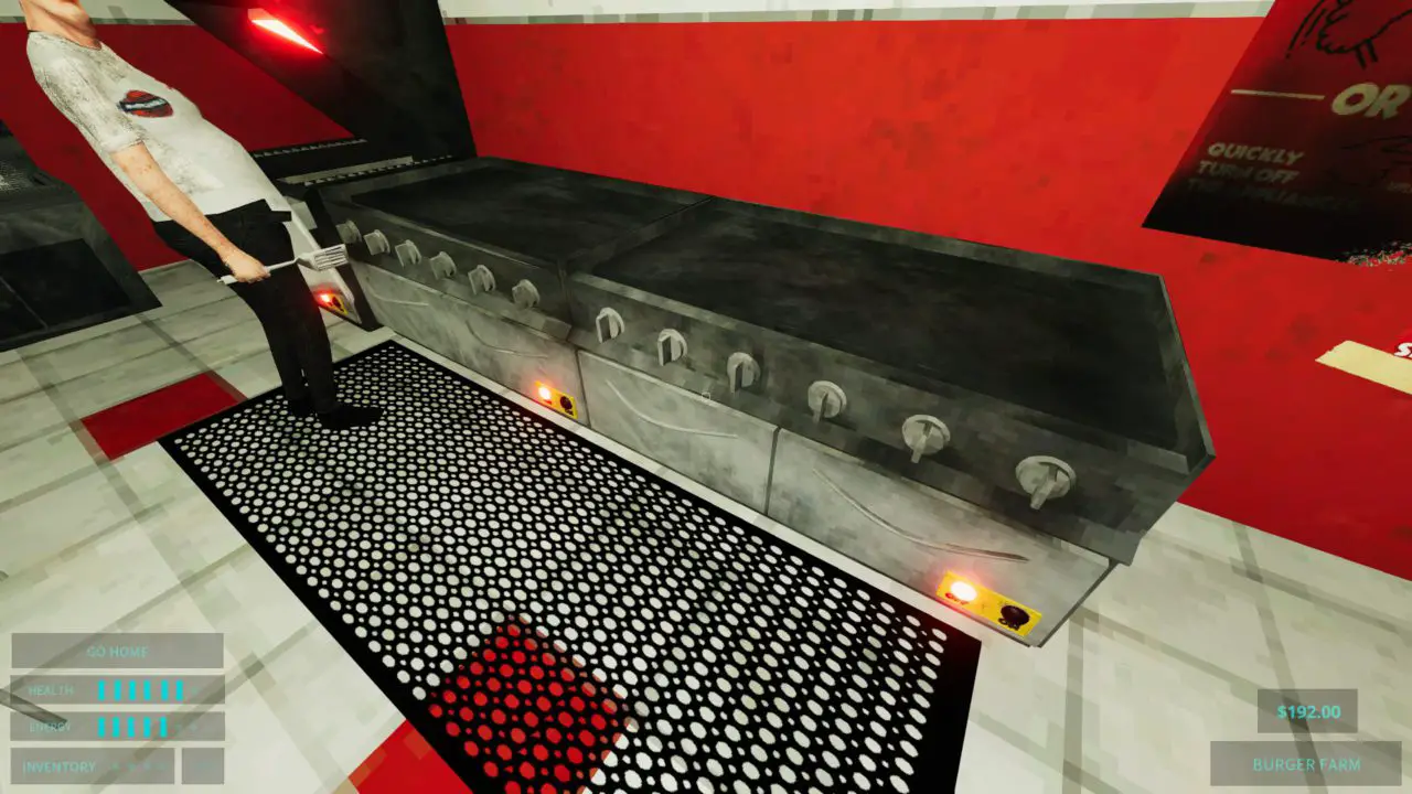 You can’t prep much before your shift starts, as you have to start said shift before you can turn the appliances on. The game doesn’t tell you this until you go to start prepping. Appliances and the kitchen lights will both turn off randomly while you’re cooking, and you’ll need to stop what you’re doing and go hit the switches to turn them back on. Which the game doesn’t tell you. There are also enemies that explode or obstruct your vision. Some will sneak up on you and hit you in the back while you’re cooking. It’s eerie and tense, sure, but awful from a gameplay perspective. Also awful is that it can be hard to tell if patties are even done, as the textures don’t make it particularly clear at times.