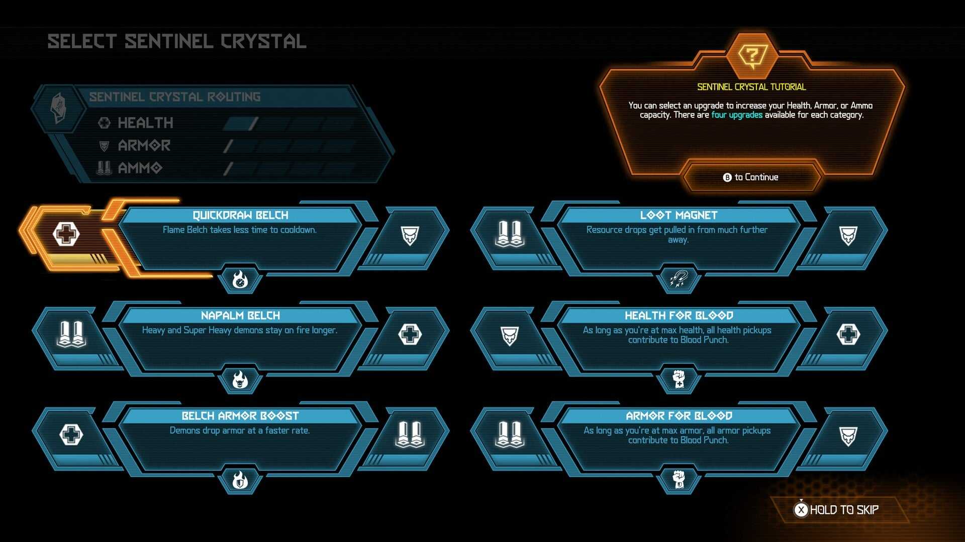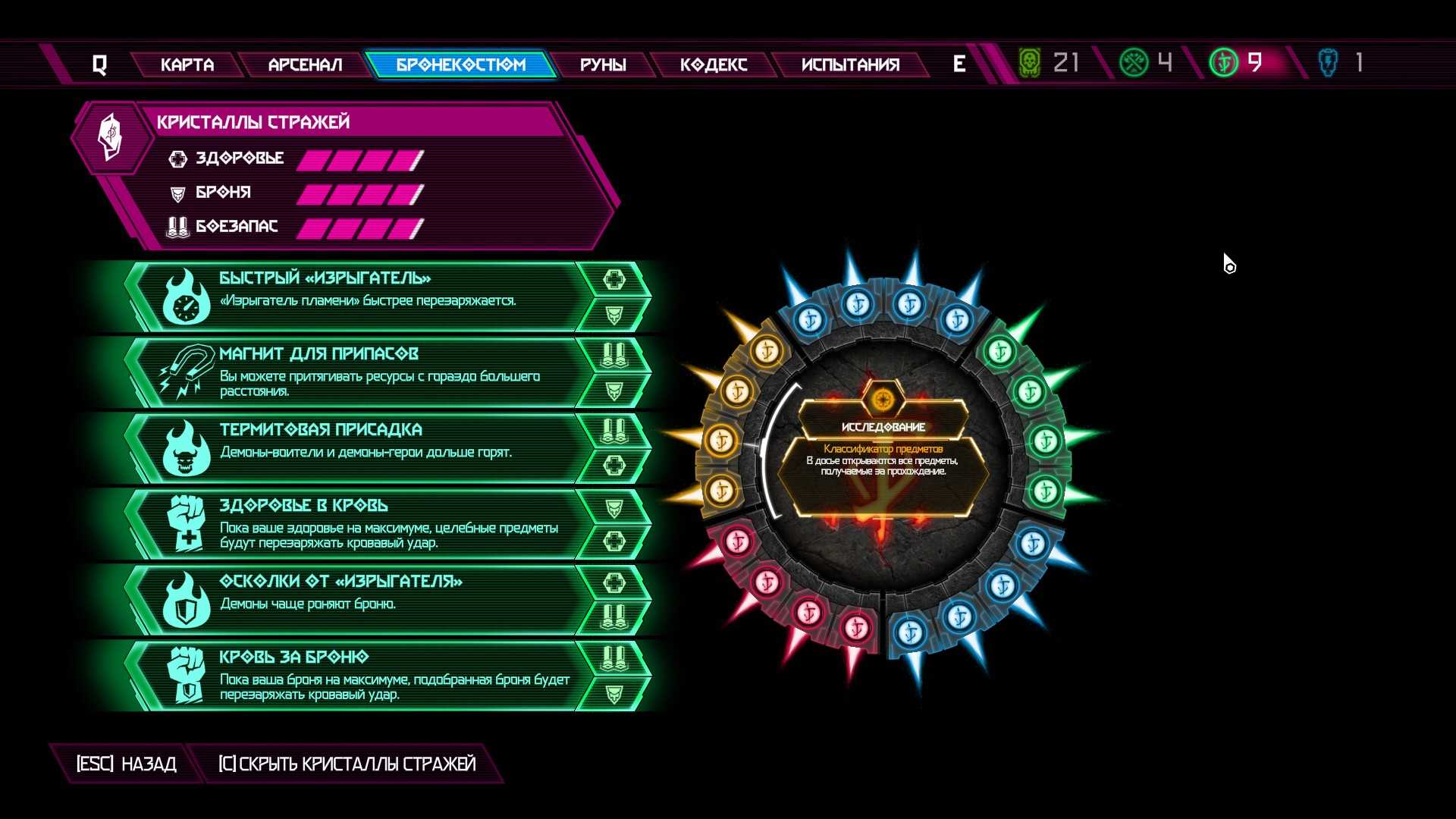 Кроме того, на уровнях периодически можно найти голубые кристаллы, прокачивающие уже самого героя: здоровье, щиты, максимальный боезапас. Параметры разбиты по парам, за завершение каждой из которой дают дополнительный бонус вроде увеличения радиуса подбора ресурсов или усиления напалма героя. Кстати, есть и отдельное колесо с улучшением стихийных способностей брони Палача.